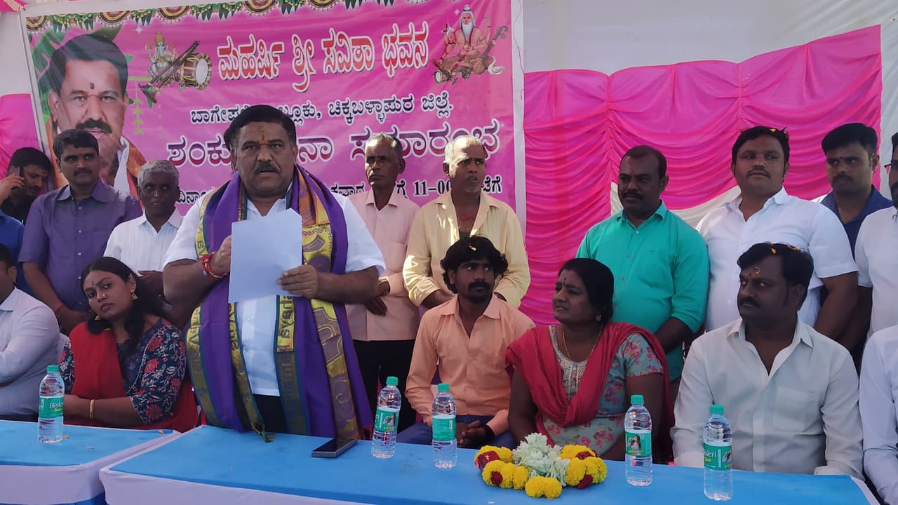ಸುಮಾರು 75 ಲಕ್ಷ ರೂ.ಗಳ ವೆಚ್ಚದಲ್ಲಿ ಸುಂದರ ಸವಿತಾ ಸಮುದಾಯ ಭವನವನ್ನು 5 ತಿಂಗಳೊಳಗೆ ನಿರ್ಮಿಸಿಕೊಡುವ ಜವಾಬ್ದಾರಿ ನನ್ನದು ಎಂದು ಶಾಸಕ ಎಸ್.ಎನ್.ಸುಬ್ಬಾರೆಡ್ಡಿ ಸವಿತಾ ಸಮುದಾಯದವರಿಗೆ ಭರವಸೆ ನೀಡಿದರು.ಪಟ್ಟಣದ ಹೊರವಲಯದ ಗಡದಿಂ ಗ್ರಾ.ಪಂ ವ್ಯಾಪ್ತಿಯ ಚಿಂತಾಮಣಿ ಮುಖ್ಯ ರಸ್ತೆಗೆ ಹೊಂದಿಕೊಂಡಿರುವ ಸುಮಾರು 8 ಗುಂಟೆ ಜಾಗದಲ್ಲಿ ಸವಿತಾ ಸಮಾಜದ ಸಮುದಾಯ ಭವನ ನಿರ್ಮಾಣಕ್ಕೆ ಗುದ್ದಲಿ ಪೂಜೆ ನೆರವೇರಿಸಿ ನಂತರ ಶಂಕುಸ್ಥಾಪನಾ ಸಮಾರಂಭ ಕಾರ್ಯಕ್ರಮದಲ್ಲಿ ಮಾತನಾಡಿದರು.