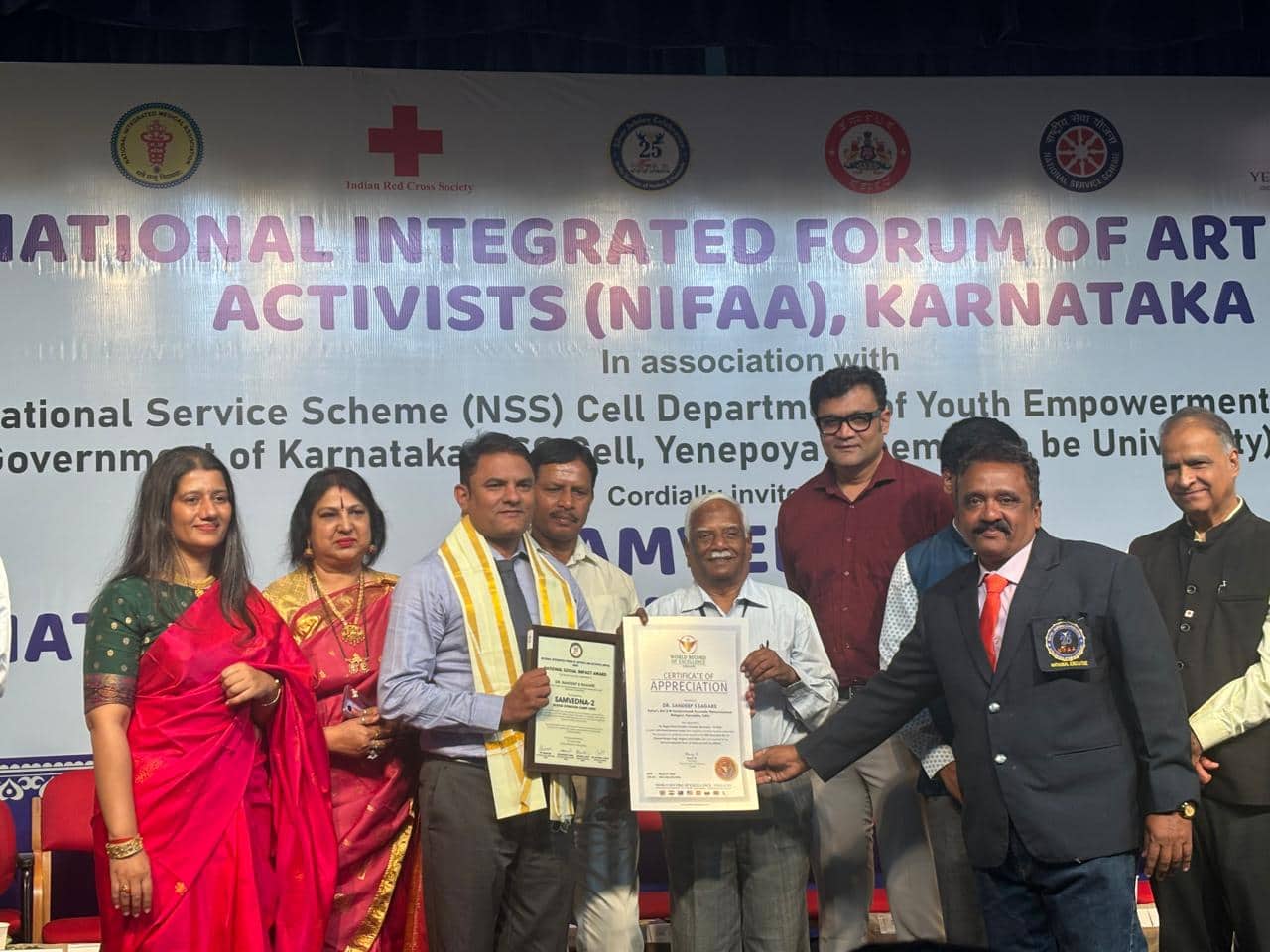 ಬೆಂಗಳೂರಿನ ಗಾಂಧಿ ಭವನದಲ್ಲಿ ಕರ್ನಾಟಕದ ನ್ಯಾಷನಲ್ ಇಂಟಿಗ್ರೇಟೆಡ್ ಫೋರಮ್ ಆಫ್ ಆರ್ಟಿಸ್ಟ್ಸ್ಆ್ಯಂಡ್ ಆಕ್ಟಿವಿಸ್ಟ್ಸ್(ಎನ್ಐಎಫ್ಎಎಸಿ) ವತಿಯಿಂದ ಸಂವೇದನಾ-2 ರಕ್ತದಾನ ಪ್ರಶಸ್ತಿ ಸಮಾರಂಭದಲ್ಲಿ ಬೆಳಗಾವಿಯ ಕೆ.ಎಲ್.ಇ ಅಕಾಡೆಮಿ ಆಫ್ ಹೈಯರ್ ಎಜುಕೇಶನ್, ಶ್ರೀ.ಬಿ.ಎಂ.ಕಂಕಣವಾಡಿ ಆಯುರ್ವೇದ ಮಹಾವಿದ್ಯಾಲಯ ಸೇರಿದಂತೆ ಎನ್ಎಸ್ಎಸ್ ಘಟಕ-3 ಸಂಯೋಜನಾಧಿಕಾರಿಯಾದ ಡಾ.ಸಂದೀಪ ಸಗರೆ ಅವರಿಗೆ ಪ್ರತ್ಯೇಕ ಮೂರು ಪ್ರಶಸ್ತಿಗಳು ಲಭಿಸಿದ್ದು, ವರ್ಡ್ ರೆಕಾರ್ಡ್ ಆಫ್ ಎಕ್ಸಲೆನ್ಸ್ ಇಂಗ್ಲೆಂಡ್ ವತಿಯಿಂದ ಪ್ರಶಂಸಾಪತ್ರಗಳನ್ನು ಪ್ರದಾನ ಮಾಡಿ ಗೌರವಿಸಲಾಯಿತು.ರಕ್ತದಾನ ಚಳುವಳಿಯಲ್ಲಿ ಗಮನಾರ್ಹ ಸೇವೆ ಸಲ್ಲಿಸಿದ ಸಂಸ್ಥೆಗಳನ್ನು ಈ ಸಂದರ್ಭದಲ್ಲಿ ಗೌರವಿಸಲಾಯಿತು. ಜೀವ ಉಳಿಸುವ ಮಾನವೀಯ ಸೇವೆಗೆ ಗೌರವ ಸೂಚಕವಾಗಿ ವರ್ಡ್ ರೆಕಾರ್ಡ್ ಆಫ್ ಎಕ್ಸಲೆನ್ಸ್, ಇಂಗ್ಲೆಂಡ್ ವತಿಯಿಂದ ಪ್ರಶಂಸಾಪತ್ರಗಳನ್ನು ಪ್ರದಾನ ಮಾಡಲಾಯಿತು. ಕರ್ನಾಟಕದ ಎಲ್ಲ ಜಿಲ್ಲೆಗಳಿಂದ ಸುಮಾರು 214 ಪ್ರಶಸ್ತಿ ಪುರಸ್ಕೃತರು ಕಾರ್ಯಕ್ರಮದಲ್ಲಿ ಭಾಗವಹಿಸಿದ್ದರು. ಜೊತೆಗೆ ಅತ್ಯುತ್ತಮ ಸಾಧನೆ ಮಾಡಿದ ಸಂಸ್ಥೆಗಳಿಗೆ ಬೆಸ್ಟ್ ಔಟ್ಸ್ಟ್ಯಾಂಡಿಂಗ್ ಆರ್ಗನೈಸೇಶನ್ ಪ್ರಶಸ್ತಿ ಪ್ರದಾನ ಮಾಡಲಾಯಿತು.ಕಾರ್ಯಕ್ರಮವನ್ನು ಇಂಡಿಯನ್ ರೆಡ್ ಕ್ರಾಸ್ ಸೊಸೈಟಿ, ನ್ಯಾಷನಲ್ ಇಂಟಿಗ್ರೇಟೆಡ್ ಮೆಡಿಕಲ್ ಅಸೋಸಿಯೇಶನ್ (ಎನ್ಐಎಂಎ), ರಾಷ್ಟ್ರೀಯ ಸೇವಾ ಯೋಜನೆ (ಎನ್ಎಸ್ಎಸ್), ಯುವ ಸಬಲೀಕರಣ ಮತ್ತು ಕ್ರೀಡಾ ಇಲಾಖೆ ಕರ್ನಾಟಕ ಸರ್ಕಾರ ಹಾಗೂ ಯೆನೆಪೋಯ ವಿಶ್ವವಿದ್ಯಾಲಯಗಳ ಸಹಯೋಗದಲ್ಲಿ ಯಶಸ್ವಿಯಾಗಿ ಜರುಗಿತು.ಸಮಾರಂಭದಲ್ಲಿ ಪದ್ಮಶ್ರೀ ಪುರಸ್ಕೃತ ಡಾ.ಸಿ.ಆರ್.ಚಂದ್ರಶೇಖರ್, ಮಹಾರಾಣಿ ಕ್ಲಸ್ಟರ್ ವಿಶ್ವವಿದ್ಯಾಲಯದ ಕುಲಪತಿ ಡಾ.ಗೋವಿಂದಪ್ಪ, ರಾಜ್ಯ ಎನ್ಎಸ್ಎಸ್ ಅಧಿಕಾರಿ ಡಾ.ಪ್ರತಾಪ್ ಲಿಂಗಯ್ಯ, ಎನ್ಐಎಂಎ ರಾಜ್ಯಾಧ್ಯಕ್ಷ ಡಾ.ಸಿದ್ದಪ್ಪ, ಡಾ.ಗುರುಮೂರ್ತಿ (ಬಿಎಸ್ಎಫ್), ಇಂಡಿಯನ್ ರೆಡ್ ಕ್ರಾಸ್ ಸಂಸ್ಥೆಯ ಅಧ್ಯಕ್ಷ ಎ.ಬಿ.ಶೆಟ್ಟಿ ಹಾಗೂ ವರ್ಲ್ಡ್ ರೆಕಾರ್ಡ್ ಆಫ್ ಎಕ್ಸಲೆನ್ಸ್ನ ಪ್ರಧಾನ ಕಾರ್ಯದರ್ಶಿ ಅಂಬಾಸಿಡರ್ ಡಾ.ನೀಲಿಮಾ, ಎನ್ಐಎಫ್ಎಎಸಿ ಸಂಸ್ಥೆಯ ಪ್ರಧಾನ ಕಾರ್ಯದರ್ಶಿ ಲಿಯಾ ಆರ್.ಕೆ.ಅಬ್ರಹಾಂ ಹಾಗೂ ಸಂಯುಕ್ತ ಕಾರ್ಯದರ್ಶಿ ಪ್ರಶಾಂತ್ ಉಪಸ್ಥಿತರಿದ್ದರು. ಎಲ್ಲ ಸಹಭಾಗಿಗಳು, ಸ್ವಯಂಸೇವಕರು ಹಾಗೂ ಸಂಸ್ಥೆಗಳಿಗೆ ಆಯೋಜಕರು ಕೃತಜ್ಞತೆ ಸಲ್ಲಿಸಿದರು. ಡಾ.ಅಶ್ವಿನಿ ಶೆಟ್ಟಿ ಅವರು ಎನ್ಐಎಫ್ಎಎಸಿ ಸಂಸ್ಥೆಯ ಚಟುವಟಿಕೆಗಳನ್ನು ಪರಿಚಯಿಸಿದರು. ನವಾಜ್ ಅವರು ಸಭಿಕರನ್ನು ಸ್ವಾಗತಿಸಿದರು. ಪ್ರಿಯಾ ವಂದಿಸಿದರು.
