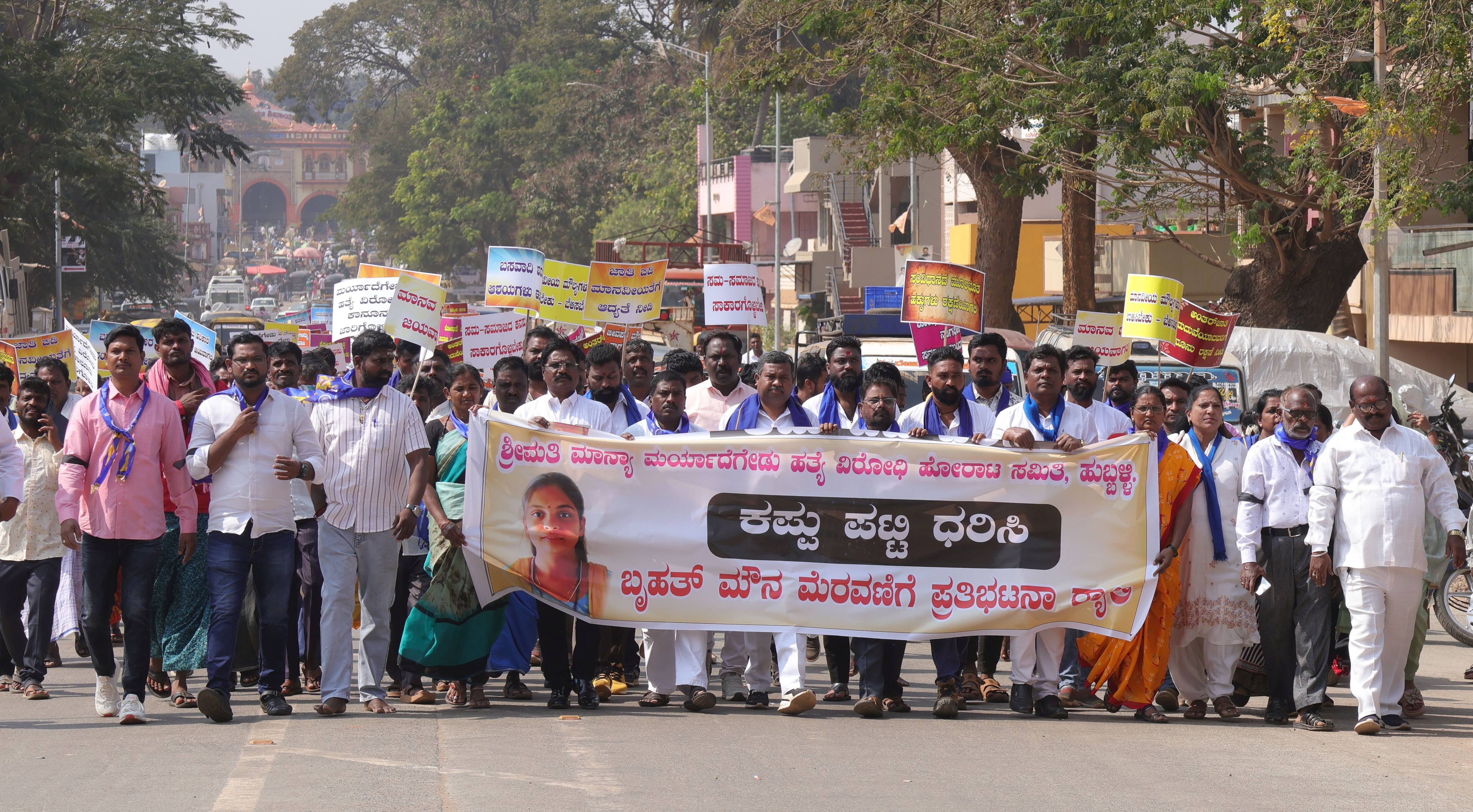 ಇನಾಂ ವೀರಾಪುರ ಗ್ರಾಮದಲ್ಲಿ ಈಚೆಗೆ ನಡೆದ ಮರ್ಯಾದಾ ಹತ್ಯೆ ಖಂಡಿಸಿ ಸೋಮವಾರ ಮಾನ್ಯಾ ಮರ್ಯಾದೆಗೇಡು ಹತ್ಯೆ ವಿರೋಧಿ ಹೋರಾಟ ಸಮಿತಿಯಿಂದ ಕಪ್ಪುಪಟ್ಟಿ ಧರಿಸಿ ನಗರದಲ್ಲಿ ಬೃಹತ್ ಮೌನ ಮೆರವಣಿಗೆ ನಡೆಸಲಾಯಿತು.ನಗರದ ಶ್ರೀಸಿದ್ಧಾರೂಢಸ್ವಾಮಿ ಮಠದಿಂದ ಆರಂಭವಾದ ಮೌನ ಮೆರವಣಿಗೆಯು ನಗರದ ಪ್ರಮುಖ ರಸ್ತೆಗಳ ಮೂಲಕ ಸಂಚರಿಸಿ ಇಲ್ಲಿನ ಸ್ಟೇಷನ್ ರಸ್ತೆಯಲ್ಲಿರುವ ಡಾ. ಬಿ.ಆರ್. ಅಂಬೇಡ್ಕರ್ ವೃತ್ತಕ್ಕೆ ಆಗಮಿಸಿ ಸಮಾರೋಪಗೊಂಡಿತು. ಧಾರವಾಡ, ಗದಗ, ಹಾವೇರಿ, ಬಳ್ಳಾರಿ, ಕೊಪ್ಪಳ, ಚಿಕ್ಕಮಗಳೂರು ಸೇರಿದಂತೆ 10ಕ್ಕೂ ಅಧಿಕ ಜಿಲ್ಲೆಗಳಿಂದ ಜನರು ಪಾಲ್ಗೊಂಡಿದ್ದರು. ಈ ವೇಳೆ ಮರ್ಯಾದಾ ಹತ್ಯೆ ಮಾಡಿದ ಆರೋಪಿಗಳಿಗೆ ಕಠಿಣ ಶಿಕ್ಷೆ ನೀಡಬೇಕು ಹಾಗೂ ದೌರ್ಜನ್ಯಕ್ಕೊಳಗಾದ ಕುಟುಂಬಕ್ಕೆ ಸೂಕ್ತ ರಕ್ಷಣೆ ಸೇರಿದಂತೆ ಪರಿಹಾರಕ್ಕೆ ಒತ್ತಾಯಿಸಲಾಯಿತು.