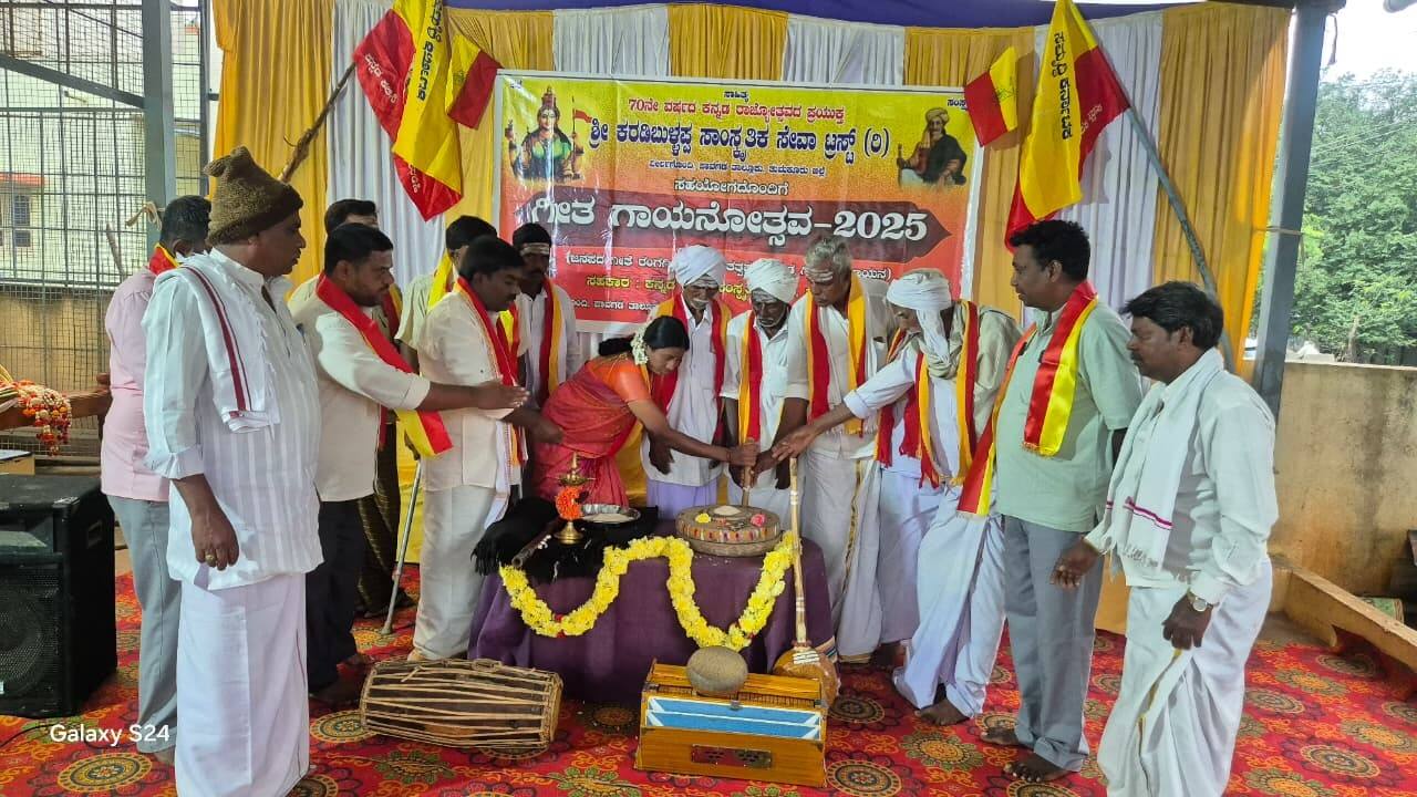 70ನೇ ಕನ್ನಡ ರಾಜ್ಯೋತ್ಸವದ ಅಂಗವಾಗಿ ಶ್ರೀ ಕರಡಿ ಬುಳ್ಳಪ್ಪ ಸಾಂಸ್ಕೃತಿಕ ಟ್ರಸ್ಟ್ ವತಿಯಿಂದ ಭಾನುವಾರ ತಾಲೂಕಿನ ವೀರ್ಲಗೊಂದಿ ಗ್ರಾಮದಲ್ಲಿ ಹಮ್ಮಿಕೊಂಡಿದ್ದ ಗೀತ ಗಾಯನೋತ್ಸವ ಜನಮನ ಸೆಳೆದಿದ್ದು ಮೂಲ ಕಲಾವಿದರಿಂದ ವಿಜೃಂಭಿಸಿತು.ಕಾರ್ಯಕ್ರಮದ ಉದ್ಘಾಟನೆಯನ್ನು ರಾಜ್ಯಮಟ್ಟದ ಲೋಕಸಿರಿ ಪ್ರಶಸ್ತಿ ಪುರಸ್ಕೃತ ಗಾಣೆ ಕಲಾವಿದರಾದ ಚಿಕ್ಕಣ್ಣ ನೆರವೇರಿಸಿದರು. ಈ ವೇಳೆ ಮಾತನಾಡಿದ ಅವರು, ಅಳಿವಿನ ಅಂಚಿನಲ್ಲಿರುವ ಮೂಲ ಜನಪದ ಕಲೆಗಳನ್ನು ಉಳಿಸಲು ಇಂತಹ ಕಾರ್ಯಕ್ರಮಗಳು ಪ್ರಮುಖ ಪಾತ್ರ ವಹಿಸುತ್ತವೆ ಎಂದು ಅಭಿಪ್ರಾಯಪಟ್ಟರು.