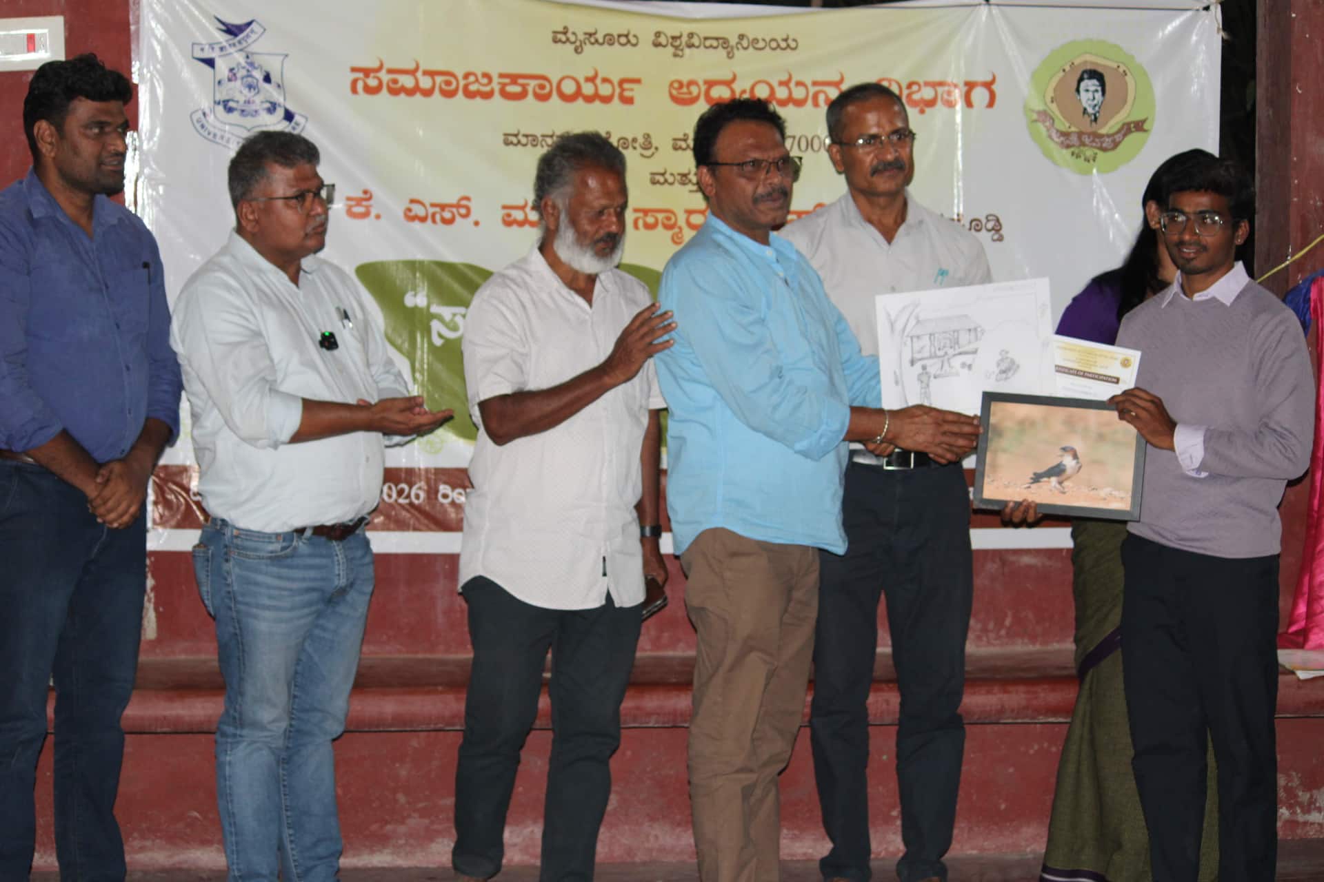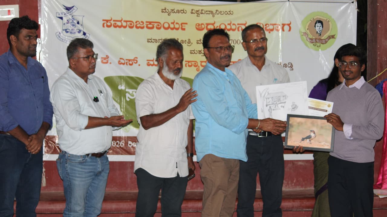 ರಾಮನಗರ ತಾಲೂಕಿನ ಕೃಷ್ಣಾಪುರದೊಡ್ಡಿಯ ಮುದ್ದುಶ್ರೀ ದಿಬ್ಬದಲ್ಲಿ ಮೈಸೂರು ವಿವಿ ಸಮಾಜಕಾರ್ಯ ವಿಭಾಗ ಹಮ್ಮಿಕೊಂಡಿದ್ದ ಸಹಭಾಗಿತ್ವ ಸಮಾಜಕಾರ್ಯ ಶಿಬಿರದ ಸಮಾರೋಪದಲ್ಲಿ ಸಾಹಿತಿ ಬಂಜಗೆರೆ ಜಯಪ್ರಕಾಶ್ ವಿಜೇತರಿಗೆ ಬಹುಮಾನ ವಿತರಿಸಿದರು.