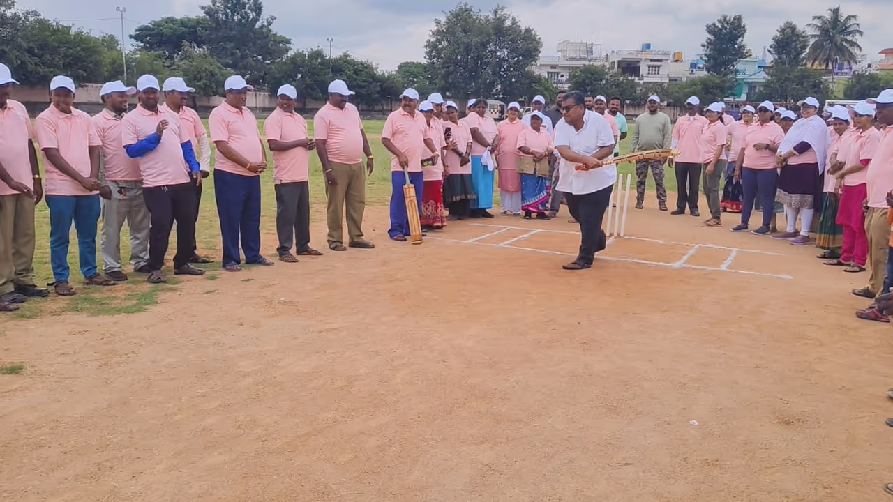 15ಕೆಆರ್ ಎಂಎನ್ 2.ಜೆಪಿಜಿರಾಮನಗರದ ಜಿಲ್ಲಾ ಕ್ರೀಡಾಂಗಣದಲ್ಲಿ ಪೌರಕಾರ್ಮಿಕರ ದಿನಾಚರಣೆಯ ಅಂಗವಾಗಿ ನಗರಸಭೆಯ ಪೌರಕಾರ್ಮಿಕರಿಗಾಗಿ ಹಮ್ಮಿಕೊಂಡಿದ್ದ ಕ್ರೀಡಾಕೂಟಕ್ಕೆ ಕೆ.ಶೇಷಾದ್ರಿ (ಶಶಿ)ರವರು ಬ್ಯಾಟಿಂಗ್ ಮಾಡುವ ಮೂಲಕ ಚಾಲನೆ ನೀಡಿದರು.