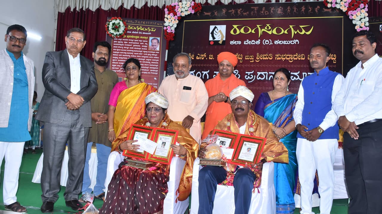 ಪ್ರಶಸ್ತಿ ಪ್ರದಾನದಲ್ಲಿ ಕಲಬುರಗಿ ತೊಗರಿ ಘಮ: ರಂಗಸಂಗಮ ಕಲಾ ವೇದಿಕೆ ರೂವಾರಿ ಡಾ. ಸುಜಾತಾ ಜಂಗಮಶೆಟ್ಟಿ ಸ್ವಾಗತದೊಂದಿಗೆ ಆರಂಭವಾದ ಸಮಾರಂಭದಲ್ಲಿ, ಸೇಡಂ ಕೊತ್ತಲ ಬಸವೇಶ್ವರ ಭಾರತೀಯ ಶಿಕ್ಷಣ ಸಮಿತಿ ಅಧ್ಯಕ್ಷ ಸದಾಶಿವ ಸ್ವಾಮೀಜಿ ಸಾನ್ನಿಧ್ಯದಲ್ಲಿ, ಕರಾಮುವಿ ಕುಲಪತಿ ಡಾ. ಶರಣಪ್ಪ ವಿ. ಹಲಸೆ ಹಾಗೂ ನಾಟಕ ಅಕ್ಯಾಡೆಮಿ ಅಧ್ಯಕ್ಷ ನಾಗರಾಜಮೂರ್ತಿ, ಶಿವಗೀತಾ ಬಸವಪ್ರಭು, ಬಿಎಚ್ ನೀರಗುಡಿ ಎಲ್ಲರೂ ಸೇರಿಕೊಂಡು ಕಲಾವಿದರಾದ ಬಳ್ಳಾರಿಯ ಪುರುಷೋತ್ತಮ ಹಂದ್ಯಾಳ್ ಅವರಿಗೆ ಎಸ್.ಬಿ. ಜಂಗಮಶೆಟ್ಟಿ ರಂಗ ಪ್ರಶಸ್ತಿ ಹಾಗೂ ಶಿಗ್ಗಾಂವ್ದ ಕಲಾವಿದೆ ರಾಧಿಕಾ ವಿ. ಬೇವಿನಮಟ್ಟಿ ಅವರಿಗೆ ಸುಭದ್ರಾದೇವಿ ಜಂಗಮಶೆಟ್ಟಿ ರಂಗ ಪ್ರಶಸ್ತಿ ಪ್ರದಾನ ಮಾಡಿದರು.