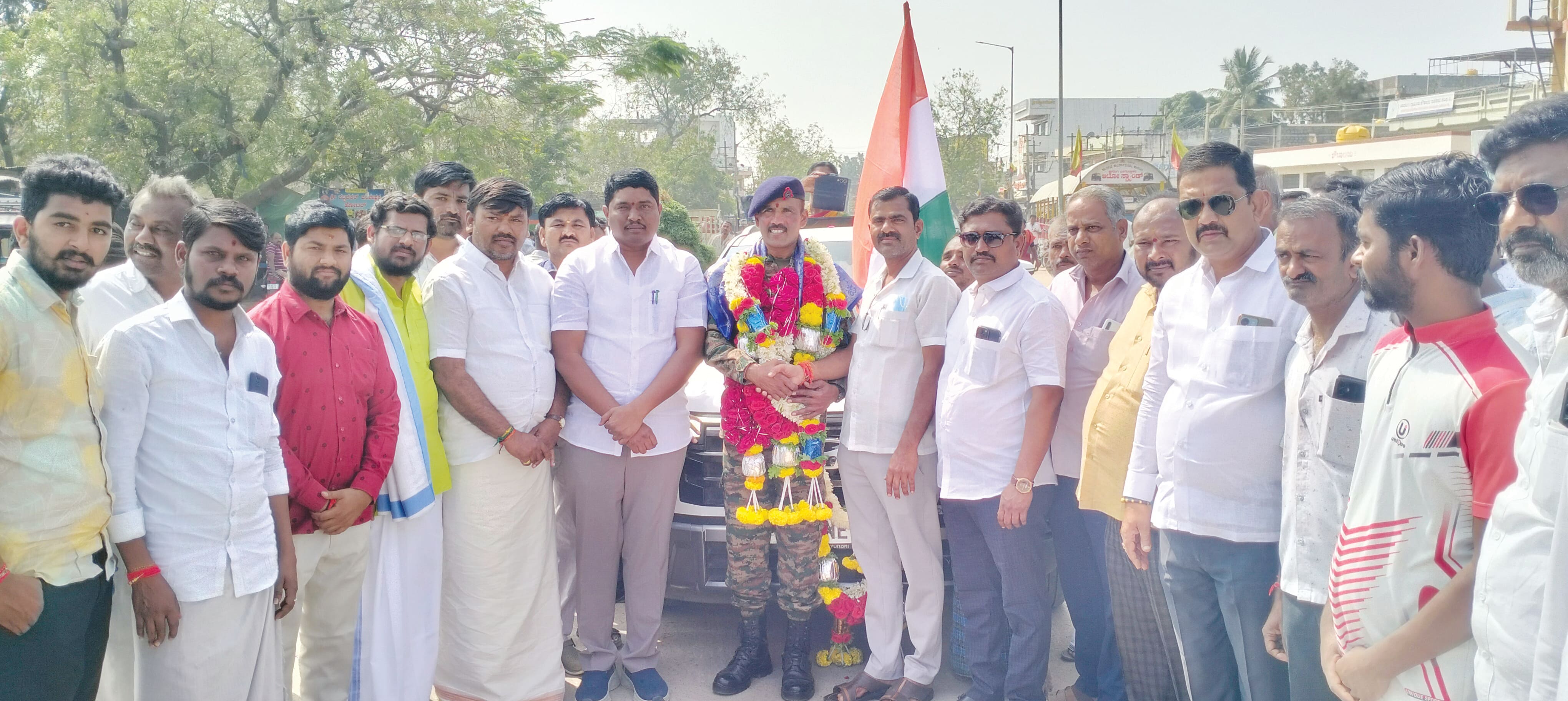 ಉತ್ತರಾಖಂಡದಲ್ಲಿ ಭಾರತೀಯ ಸೇನೆ ನೆಲದಲ್ಲಿ ವಿವಿಧ ಹುದ್ದೆಗಳಲ್ಲಿ ಸೇವೆ ಸಲ್ಲಿಸಿ ಜ.೩೧ರಂದು ನಿವೃತ್ತಿ ಹೊಂದಿದ ವೀರೇಶ ಜಮ್ಮುಕಾಶ್ಮೀರದಿಂದ ಬೆಂಗಳೂರು ಮೂಲಕ ಪಟ್ಟಣಕ್ಕೆ ಮಂಗಳವಾರ ಆಗಮಿಸಿ ತಮ್ಮ ತವರು ಮೈಲಾಪೂರಕ್ಕೆ ತೆರಳುವ ಮಾರ್ಗ ಮಧ್ಯ ಇಲ್ಲಿನ ಪುರಸಭೆ,ಕಂದಾಯ ಮತ್ತು ಪೊಲೀಸ್ ಇಲಾಖೆ ಸೇರಿದಂತೆ ವಿವಿಧ ಸಂಘ ಸಂಸ್ಥೆಗಳ ಪದಾಧಿಕಾರಿಗಳು ಸೇರಿ ಯೋಧ ವೀರೇಶ ಗೆ ನೆರೆದಿದ್ದ ಮಹಿಳೆಯರು ಸಿಂಧೂರವಿಟ್ಟು ಕಳಸ ಬೆಳಗಿ ಪೂರ್ಣಕುಂಭದೊಂದಿಗೆ ಅದ್ಧೂರಿಯಾಗಿ ಸ್ವಾಗತಿಸಿದರು.ಪುರಸಭೆ ಮುಖ್ಯಾಧಿಕಾರಿ ಡಾ. ಸಾಬಣ್ಣ ಕಟ್ಟೇಕಾರ ಮಾತನಾಡಿ, ಭಾರತವು ಜಗತ್ತಿನ ಬಲಿಷ್ಟ ರಾಷ್ಟ್ರವಾಗಿ ರೂಪುಗೊಳ್ಳುವಲ್ಲಿ ಯೋಧರ ಪರಿಶ್ರಮವಿದೆ.ಯುವ ಸಮೂಹ ದೇಶ, ಸಮಾಜ ಸೇವೆಯಲ್ಲಿ ತೊಡಗಿಸಿಕೊಳ್ಳಬೇಕು ಎಂದರು.