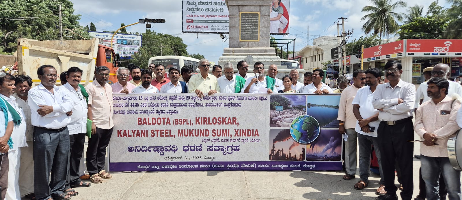 ನಗರಸಭೆ ಸಂಕೀರ್ಣದ ಬಳಿ ಜಂಟಿ ಕ್ರಿಯಾ ವೇದಿಕೆ (ಕೊಪ್ಪಳ ಜಿಲ್ಲಾ ಬಚಾವೋ ಆಂದೋಲನ ಮತ್ತು ಪರಿಸರ ಹಿತರಕ್ಷಣಾ ವೇದಿಕೆ) ಮೂಲಕ ಹಮ್ಮಿಕೊಂಡಿರುವ ಬಿಎಸ್ ಪಿಎಲ್ ಕಾರ್ಖಾನೆ ಅನುಮತಿ ರದ್ಧತಿ ಹಾಗೂ ಇತರೆ ಕಾರ್ಖಾನೆಗಳ ವಿಸ್ತೀರ್ಣ ಮತ್ತು ಆರಂಭ ವಿರೋಧಿಸಿ ಅನಿರ್ಧಿಷ್ಠಾವಧಿ ಧರಣಿ ಸತ್ಯಾಗ್ರಹಕ್ಕೆ ಗಾಂಧೀಜಿ ಮತ್ತು ಬಾಬಾಸಾಹೇಬರ ಭಾವಚಿತ್ರಕ್ಕೆ ಮಾಲಾರ್ಪಣೆ ಮಾಡುವ ಮೂಲಕ ಚಾಲನೆ ನೀಡಿ ಮಾತನಾಡಿದರು.ಇಲ್ಲಿ ಹಣ ಹೂಡಿಕೆ ಮಾಡುವುದು ದೊಡ್ಡ ಸಂಗತಿ ಎಂದು ಭಾವಿಸಿರುವುದೇ ಬಹುದೊಡ್ಡ ತಪ್ಪು, ಹಣದ ಲೆಕ್ಕದಲ್ಲಿ ಜನರಿಗೆ ಬದುಕು ಸಿಗಲ್ಲ. ಜಿಂದಾಲ್ ನಂತಹ ಬೃಹತ್ ಕಾರ್ಖಾನೆ ಏನು ಹೇಳಿ ಬಳ್ಳಾರಿಯಲ್ಲಿ ಬಂದಿತ್ತು ಅದ್ಯಾವುದೂ ಆಗದೇ ಅಲ್ಲಿ ಜನ ಕಂಗಾಲಾಗಿದ್ದಾರೆ, ಬಹುತೇಕ ಕಂಪನಿಗಳು ಈಗ ಉದ್ಯೋಗ ಕಡಿತ ಆರಂಭಿಸಿವೆ. ಈಗ ಉದ್ಯೋಗ ಕೊಡ್ತಿವಿ ಅಂದವರು ಮುಂದೆ ಕೊಡಲು ಸಾಧ್ಯವಿಲ್ಲ ಎನ್ನುತ್ತಾರೆ. ಅದು ಏನೇ ಇದ್ದರೂ ಉದ್ಯೋಗಕ್ಕಿಂತ ಮೊದಲು ಆರೋಗ್ಯ ಹಾಗೂ ಬದುಕು ಮುಖ್ಯ ಎಂದರು.