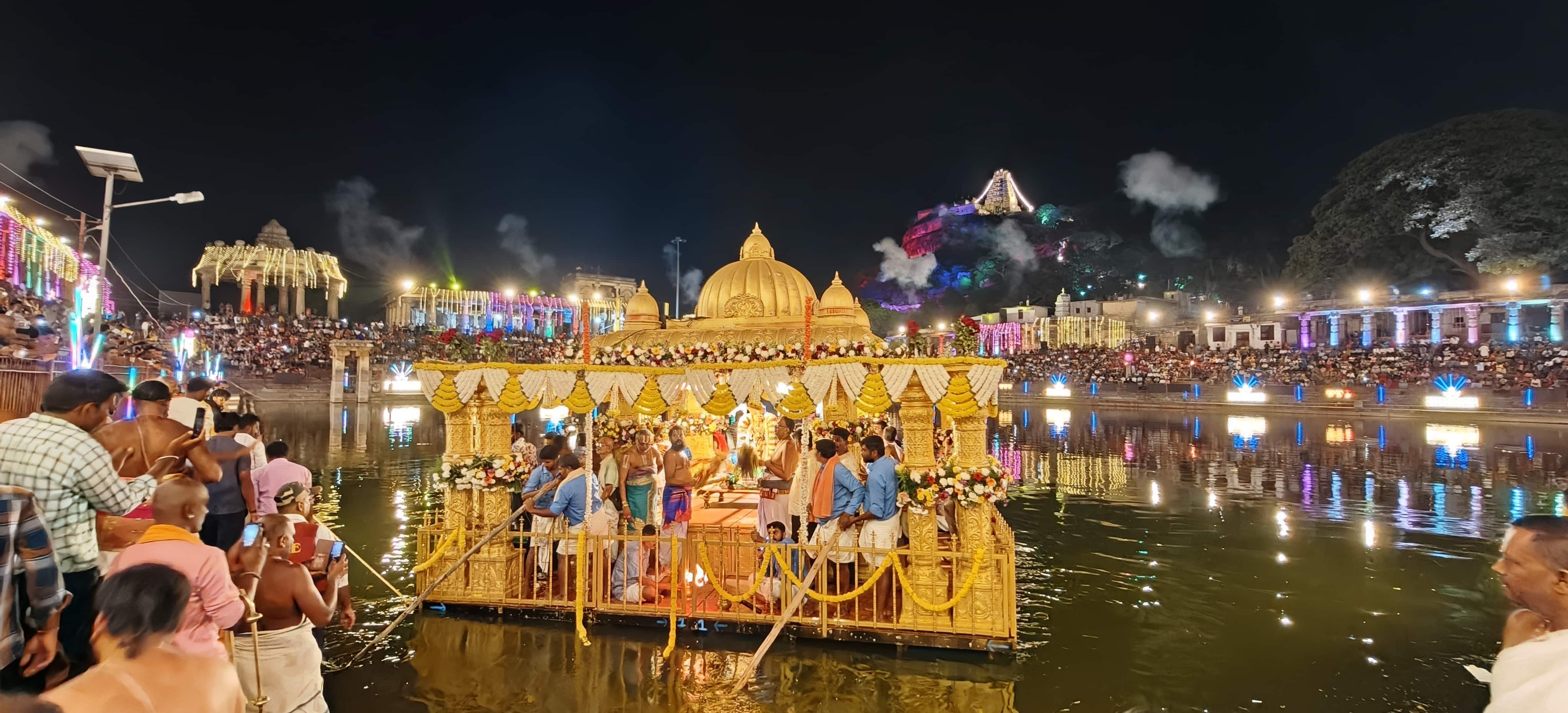 ತೆಪ್ಪೋತ್ಸವದ ಆರಂಭದ ವೇಳೆ ಸ್ಕೈಶಾಟ್ಸ್ ಸಿಡಿಸಿದಾಗ ಭಕ್ತರ ಹರ್ಷೋದ್ಘಾರ ಮುಗಿಲುಮುಟ್ಟಿತ್ತು. ಎರಡು ವರ್ಷದ ನಂತರ ಮಾಡಿದ ಲೇಸರ್ ಷೋ ಸಹ ಗಮನ ಸೆಳೆಯಿತು. ಅಪರ ಜಿಲ್ಲಾಧಿಕಾರಿ ಶಿವಾನಂದಮೂರ್ತಿ ಆಸಕ್ತಿಯ ಪರಿಣಾಮ ವಿಶೇಷವಾಗಿ ನಡೆದ ವೈರಮುಡಿ ತೆಪ್ಪೋತ್ಸವದ ಮೂರು ಸುತ್ತಿನ ವೇಳೆ ಮ್ಯಾಂಡಲಿನ್ ಮಾಂತ್ರಿಕ ಯು.ಶ್ರೀನಿವಾಸ್ ಶಿಷ್ಯ ವೆಂಕಟೇಶ್ರಿಂದ ಮ್ಯಾಂಡಲಿನ್ ವಾದನ, ಹಿರಿಯ ಐ.ಎ.ಎಸ್ ಅಧಿಕಾರಿ ಯಶವಂತರ ಸಹೋದರನ ಪುತ್ರಿ ಭೂಮಿಕಾಮಂಜಪ್ಪ ತಂಡದಿಂದ ಭರತನಾಟ್ಯ ಪ್ರದರ್ಶನ, ಎಸ್.ಎನ್.ಐ ಸಾಂಸ್ಕೃತಿಕ ವೇದಿಕೆಯ ನಾದೋಪಾಸನ ಸೇವೆಯಡಿ ಆಕಾಶವಾಣಿ ಎಗ್ರೇಡ್ ಕಲಾವಿದ ವಿದ್ವಾನ್ ಶ್ರೀಧರ ತಂಡದ ವಿಶೇಷ ನಾದಸ್ವರ ವಾದನ ತೆಪ್ಪೋತ್ಸವದ ವೈಭವದ ಕ್ಷಣಗಳಿಗೆ ನಾದ ಮಾಧುರ್ಯ ತುಂಬಿತು.ಇಂದು ತೀರ್ಥಸ್ನಾನ ಅವಭೃತ ಪಟ್ಟಾಭಿಷೇಕ: