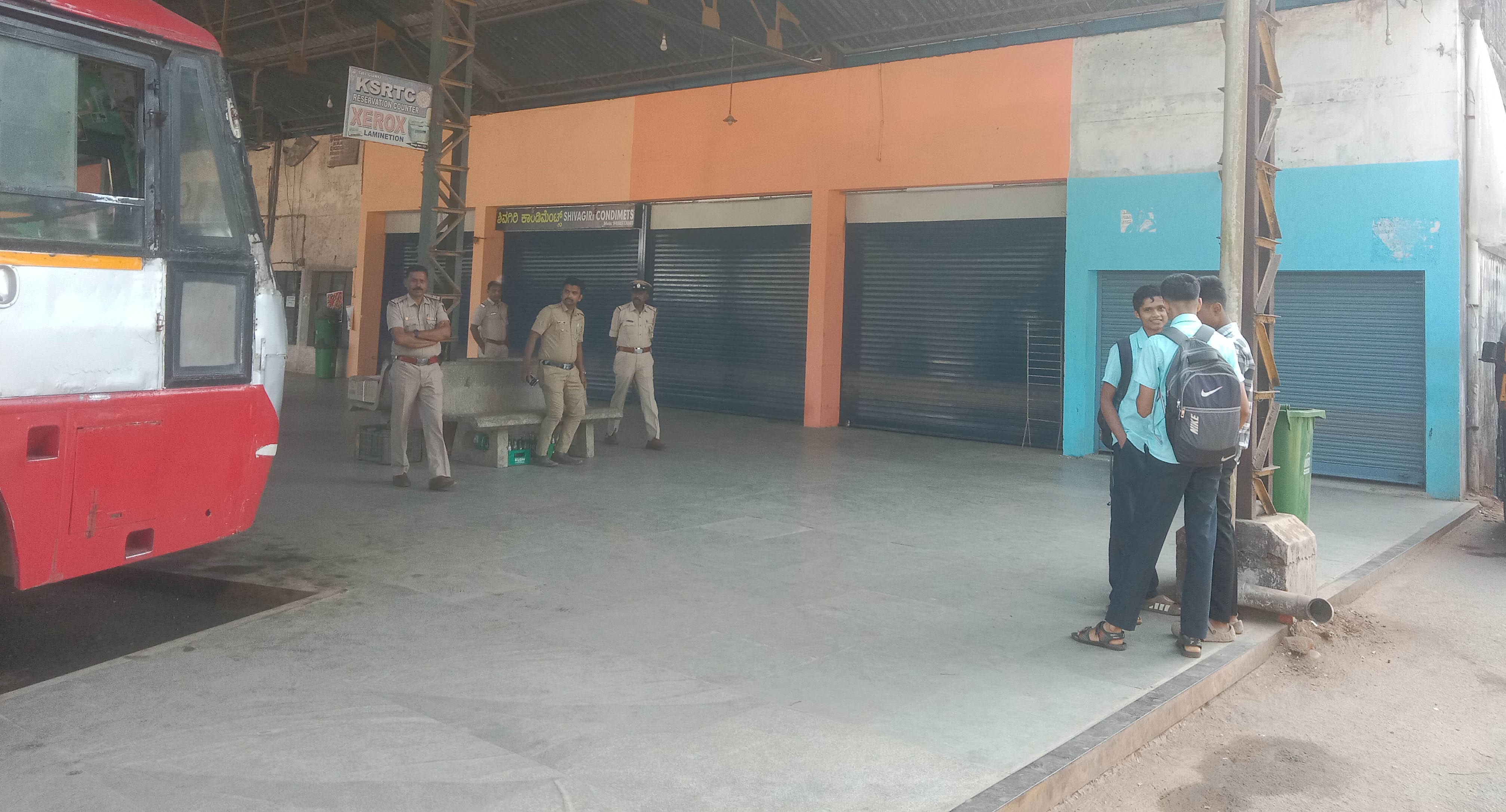 ಸೋಮವಾರ ಶೃಂಗೇರಿ ಕ್ಷೇತ್ರ ಬಂದ್ ಹಿನ್ನೆಲೆಯಲ್ಲಿ ಬಸ್ ನಿಲ್ದಾಣದಲ್ಲಿ ಅಂಗಡಿಗಳು ಮುಚ್ಚಿರುವುದು.