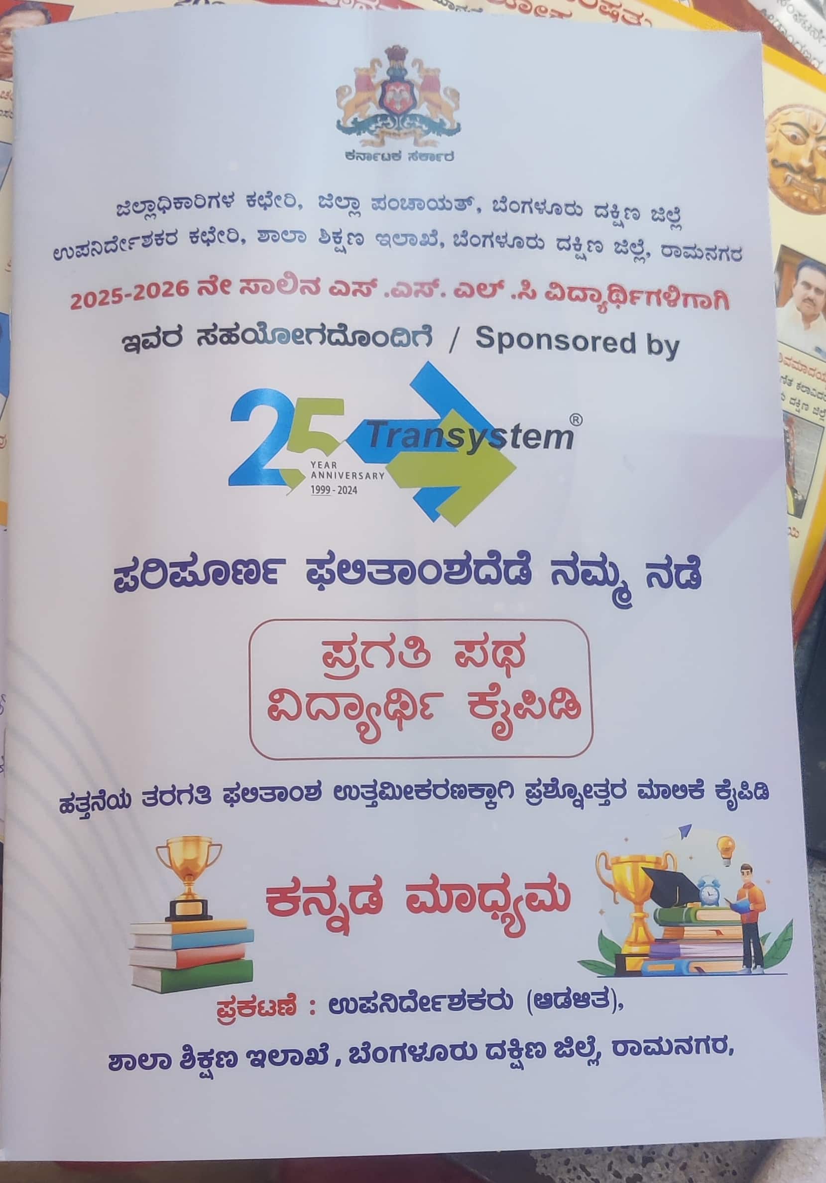 ಟ್ರಾನ್ಸಿಸ್ಟಮ್ ಕಂಪನಿ ನೆರವು :ಎಸ್ಸೆಸ್ಸೆಲ್ಸಿ ಪರೀಕ್ಷೆ ಫಲಿತಾಂಶದಲ್ಲಿ ಸುಧಾರಣೆ ತರುವ ಪ್ರಯತ್ನಕ್ಕೆ ಟ್ರಾನ್ ಸಿಸ್ಟಮ್ ಎಂಬ ಕಂಪನಿಯು ಶಿಕ್ಷಣ ಇಲಾಖೆಯೊಂದಿಗೆ ಕೈ ಜೋಡಿಸಿದೆ. ಇಲಾಖೆಯು ಪರಿಪೂರ್ಣ ಫಲಿತಾಂಶದೆಡೆ ನಮ್ಮ ನಡೆ ಘೋಷಣೆ ಅಡಿಯಲ್ಲಿ ಸಿದ್ದಪಡಿಸಿರುವ ಪ್ರಗತಿ ಪಥ ವಿದ್ಯಾರ್ಥಿ ಕೈಪಿಡಿಯನ್ನು ಈ ಕಂಪನಿ ತನ್ನ ಕಾರ್ಪೋರೇಟ್ ಸಾಮಾಜಿಕ ಹೊಣೆಗಾರಿಕೆಯಡಿ (ಸಿಎಸ್ಆರ್) ಮುದ್ರಣ ಮಾಡಿ ಕೊಟ್ಟಿದೆ.