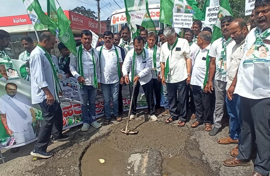 ಜೆಡಿಎಸ್ ನಿಂದ ಹೆದ್ದಾರಿಯಲ್ಲಿ ಬಿದ್ದಿದ್ದ ಗುಂಡಿಗಳಿಗೆ ಕಾಂಕ್ರೀಟ್ ಹಾಕಿ ಮುಚ್ಚಿ ಪ್ರತಿಭಟನೆ