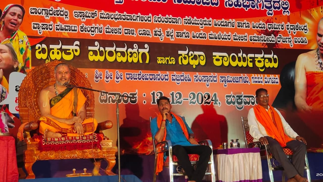 ಜೈಲಿನಲ್ಲಿದ್ದ ಉಗ್ರಗಾಮಿ ಸಂಘಟನೆಯ ವ್ಯಕ್ತಿಯನ್ನು ಬಿಡುಗಡೆಗೊಳಿಸಲಾಗಿದೆ. ಭಾರತ ಎಲ್ಲವನ್ನೂ ಸೂಕ್ಷ್ಮವಾಗಿ ವೀಕ್ಷಿಸುತ್ತಿದ್ದು, ಹಿಂದೂಗಳ ಮೇಲೆ ಬಾಂಗ್ಲಾದಲ್ಲಿ ದೌರ್ಜನ್ಯ ಅತಿರೇಕಕ್ಕೆ ಹೋದರೆ ಭಾರತ ಖಂಡಿತ ಸುಮ್ಮನಿರುವುದಿಲ್ಲ. ದೌರ್ಜನ್ಯ ನಡೆಸುವ ಅಲ್ಲಿನ ಜನರಿಗೆ ಮತ್ತು ಸರ್ಕಾರಕ್ಕೆ ಪಾಠ ಕಲಿಸದೇ ಬಿಡುವುದಿಲ್ಲ ಎಂದ ಸ್ವಾಮೀಜಿ, ಹಿಂದೂಗಳು ಒಗ್ಗಟ್ಟಾಗಿ ಸದೃಢರಾಗಬೇಕು. ಭಾರತದಲ್ಲಿ ನಾವು ಎಂದಿಗೂ ಅಲ್ಪಸಂಖ್ಯಾತರಾಗಬಾರದು.ಹಿಂದೂ ಜಾಗರಣ ವೇದಿಕೆಯ ದಕ್ಷಿಣ ಪ್ರಾಂತ ಸಂಚಾಲಕ ಕಾರ್ಕಳದ ಶ್ರೀಕಾಂತ ಶೆಟ್ಟಿ ಮಾತನಾಡಿ, ಬಾಂಗ್ಲಾದಲ್ಲಿ ಹಿಂದೂಗಳ ಮೇಲೆ ನಿರಂತರವಾಗಿ ಅತ್ಯಾಚಾರ, ಕೊಲೆ, ಸುಲಿಗೆ,ದೌರ್ಜನ್ಯ ನಡೆಯುತ್ತಿದ್ದರೂ ಮಾನವ ಹಕ್ಕು ಸಂಘಟನೆಗಳು, ಸೆಲೆಬ್ರೆಟಿಗಳು ಬಾಯಿ ಮುಚ್ಚಿಕೊಂಡು ಕುಳಿತಿದ್ದಾರೆ. ಬಾಂಗ್ಲಾದ ಹಿಂದೂಗಳ ಮೇಲಿನ ದೌರ್ಜನ್ಯವನ್ನು ಹಿಂದೂ ಸಂಘಟನೆಗಳು ಮಾತ್ರ ಖಂಡಿಸುತ್ತಿವೆ. ಅಲ್ಲಿನ ಹಿಂದೂಗಳಿಗೆ ಪ್ರತ್ಯೇಕ ದೇಶಕ್ಕೆ ಒತ್ತಾಯಿಸಬೇಕು ಎಂದರು.