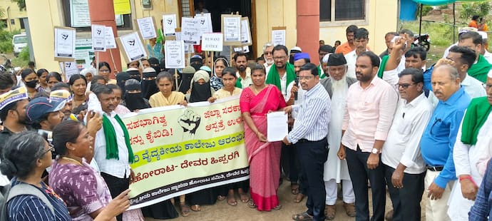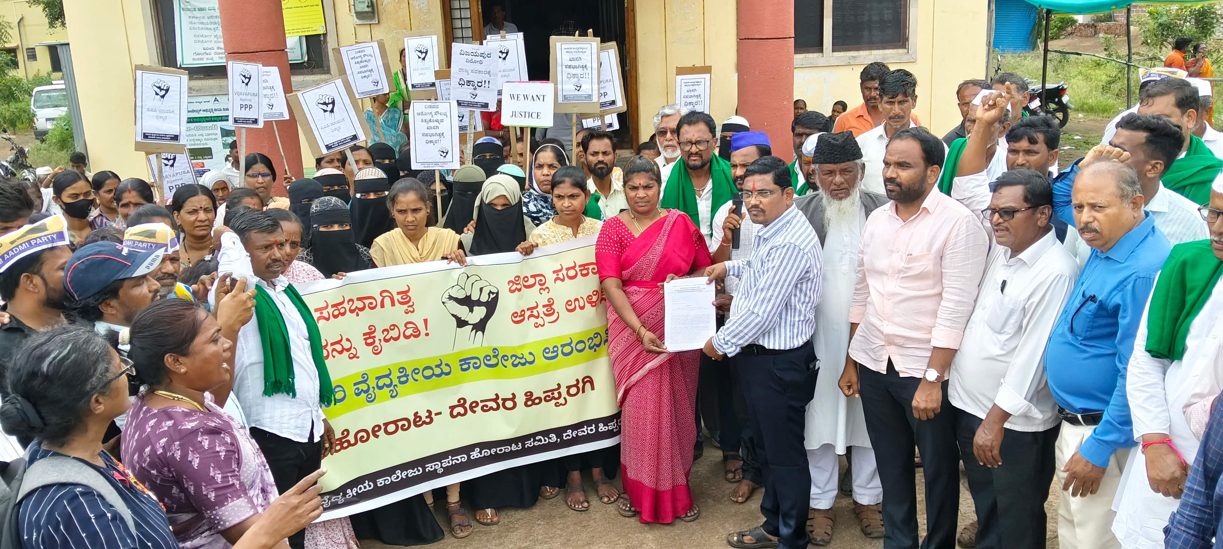 ವಿಜಯಪುರ ಪಟ್ಟಣದಲ್ಲಿ ಪಿಪಿಪಿ ಮಾದರಿಯಲ್ಲಿ ವೈದ್ಯಕೀಯ ಕಾಲೇಜು ಸ್ಥಾಪನೆ ಮಾಡಲು ಮುಂದಾಗಿರುವ ಸರ್ಕಾರದ ನಡೆಗೆ ಹಲವು ಪ್ರಗತಿಪರ ಸಂಘಟನೆಗಳು ವಿರೋಧ ವ್ಯಕ್ತಪಡಿಸಿದ್ದು, ಪಟ್ಟಣದಲ್ಲಿ ಪ್ರತಿಭಟನೆ ನಡೆಸಿದರು.ಪಟ್ಟಣದಲ್ಲಿ ಗುರುವಾರ ಡಾ.ಅಂಬೇಡ್ಕರ್ ವೃತ್ತದಿಂದ ತಹಸೀಲ್ದಾರ್ ಕಚೇರಿಗೆ ಆಗಮಿಸಿದ್ದ ಜೆಎಂಜೆ ಸಂಸ್ಥೆ ಹಾಗೂ ವಿವಿಧ ಪ್ರಗತಿಪರ ಸಂಘಟನೆಗಳ ಸಂಘದ ಪ್ರತಿಭಟನಾಕಾರರು ಪ್ರತಿಭಟಿಸಿ ತಹಸೀಲ್ದಾರ್ ಪ್ರಕಾಶ ಸಿಂದಗಿಗೆ ಮನವಿ ಸಲ್ಲಿಸಿ ಸರ್ಕಾರಕ್ಕೆ ಆಗ್ರಹಿಸಿದರು.ಮುಖಂಡರಾದ ಶ್ರೀನಾಥ ಪೂಜಾರಿ, ಭೋಗೇಶ ಸೋಲಾಪುರ ಹಾಗೂ ಪ್ರಕಾಶ ಗುಡಿಮನಿ ಮಾತನಾಡಿ, ಸರ್ಕಾರದ ಮಟ್ಟದಲ್ಲಿ ಪಿಪಿಪಿ ಮಾದರಿಯಲ್ಲಿ ವೈದ್ಯಕೀಯ ಕಾಲೇಜು ಸ್ಥಾಪನೆ ಮಾಡಬೇಕೆಂದು ಹುನ್ನಾರ ನಡೆದಿದೆ. ಜಿಲ್ಲೆಯಲ್ಲಿ ಹಲವು ಶಾಸಕರು ಈ ಕುರಿತು ವಿರೋಧ ವ್ಯಕ್ತಪಡಿಸಿಲ್ಲ. ತಿಂಗಳಾದರೂ ಉಸ್ತುವಾರಿ ಸಚಿವರು ಸರ್ಕಾರದ ಉದ್ದೇಶ ತಿಳಿಸಿಲ್ಲ, ಶಾಸಕರು ಒಬ್ಬರು ಬಂಡವಾಳ ಹೂಡುವುದಾಗಿ ವಿಧಾನಸಭೆಯಲ್ಲಿ ಭರವಸೆ ನೀಡಿದ್ದಾರೆ ಇದು ಸಲ್ಲದು. ಸರ್ಕಾರಿ ವೈದ್ಯಕೀಯ ಕಾಲೇಜ ನಿರ್ಮಾಣಕ್ಕೆ ಜಿಲ್ಲೆಯ ಪ್ರತಿ ಗ್ರಾಮ ಪಂಚಾಯಿತಿ ಮಟ್ಟದಲ್ಲಿ ಪ್ರತಿಭಟನೆ ಹಮ್ಮಿಕೊಂಡು ಸರ್ಕಾರಕ್ಕೆ ಬಿಸಿ ಮುಟ್ಟಿಸುತ್ತೇವೆ ಎಂದ ಪ್ರತಿಭಟನಾಕಾರರು, ಪಿಪಿಪಿ ಮಾದರಿಯ ವೈದ್ಯಕೀಯ ಕಾಲೇಜು ಸ್ಥಾಪನೆ ಮಾತ್ರ ಬೇಡ ಎಂದು ಆಗ್ರಹಿಸಿದರು.