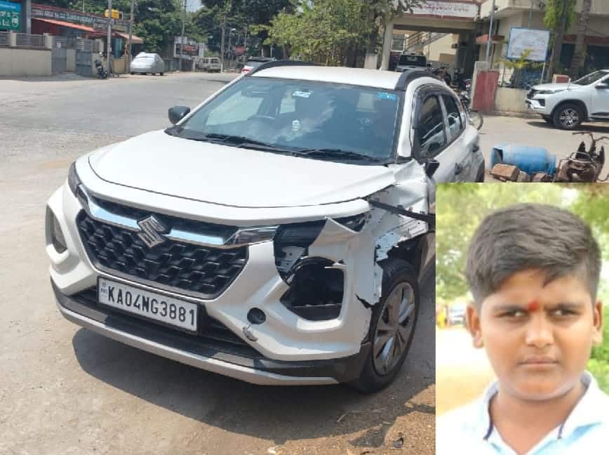 28ಎಚ್ಎಸ್ಎನ್4 : ಅಪಘಾತಕ್ಕೆ ಕಾರಣವಾದ ಕಾರು. ಒಳ ಚಿತ್ರದಲ್ಲಿ ಮೃತಪಟ್ಟ ಬಾಲಕ. | Kannada Prabha