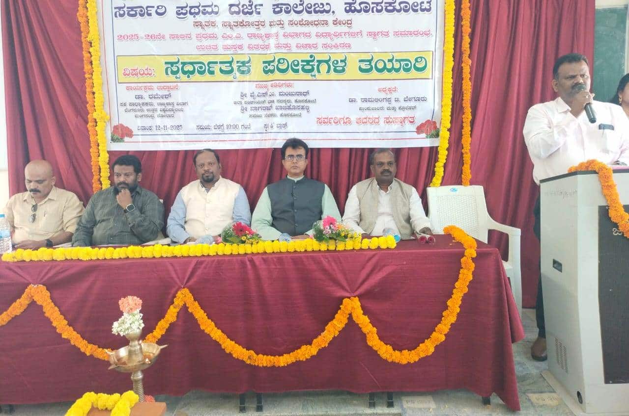 ನಗರದ ಸರಕಾರಿ ಪ್ರಥಮ ದರ್ಜೆ ಕಾಲೇಜು ಹೊಸಕೋಟೆ ಕಾಲೇಜಿನ ರಾಜ್ಯ ಶಾಸ್ತ್ರ ವಿಭಾಗ ಸ್ನಾತಕೋತ್ತರ ವಿಭಾಗದಿಂದ 2025-26ನೇ ಸಾಲಿನ ಪ್ರಥಮ ಎಂ.ಎ ರಾಜ್ಯಶಾಸ್ತ್ರ ವಿಭಾಗದ ವಿದ್ಯಾರ್ಥಿಗಳಿಗೆ ಸ್ವಾಗತ ಸಮಾರಂಭ ಉಚಿತ ಪುಸ್ತಕ ವಿತರಣೆ ಮತ್ತು ವಿಚಾರ ಸಂಕಿರಣ ಕಾರ್ಯಕ್ರಮದಲ್ಲಿ ಮಾತನಾಡಿದರು.ಪದವಿ ಪಡೆದ ಎಲ್ಲರೂ ಸ್ಪರ್ಥಾತ್ಮಕ ಪರೀಕ್ಷೆ ತೆಗೆದುಕೊಳ್ಳುವುದಕ್ಕೆ ಅರ್ಹರು. ಅದಕ್ಕಾಗಿ ಯಶ್ವಸನ್ನು ಗಳಿಸಲು ಕಠಿಣ ಪರಿಶ್ರಮ ಪಡಬೇಕು. ಮೊಬೈಲ್ ಬಳಕೆ ಅದಷ್ಟು ಕಡಿಮೆ ಮಾಡಿ. ಹೆಚ್ಚು ಹೆಚ್ಚು ದಿನಪತ್ರಿಕೆ ಓದಬೇಕು. ಆಗ ಮಾತ್ರ ನಿಮ್ಮ ಗುರಿ ಮುಟ್ಟಲು ಸಾಧ್ಯವಿದೆ ಎಂದರು.