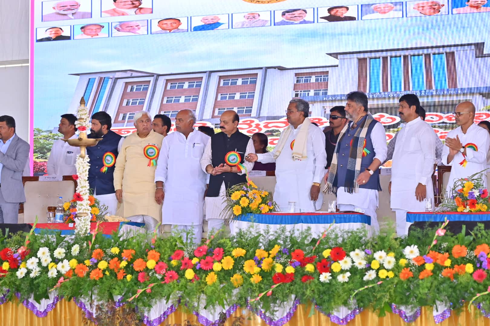 ₹1400 ಕೋಟಿ ವೆಚ್ಚದಲ್ಲಿ ಬಹುಗ್ರಾಮ ಕುಡಿಯುವ ನೀರಿನ ಯೋಜನೆ ನಡೆಯುತ್ತಿದೆ. ₹120 ಕೋಟಿ ವೆಚ್ಚದಲ್ಲಿ ಹಾವೇರಿ ನಗರಕ್ಕೆ ಕುಡಿಯುವ ನೀರು ಪೂರೈಸುವ ಯೋಜನೆ ನಡೆಯುತ್ತಿದೆ. ಎಪಿಎಂಸಿ ಇಲಾಖೆಯಿಂದ ಎರಡು ಕೋಲ್ಡ್ ಸ್ಟೋರೇಜ್ ಕೊಟ್ಟಿದ್ದೇವೆ ಎಂದರು.ವಿಧಾನಸಭೆ ಉಪಾಧ್ಯಕ್ಷ ರುದ್ರಪ್ಪ ಲಮಾಣಿ ಅಧ್ಯಕ್ಷತೆ ವಹಿಸಿದ್ದರು. ಸಿಎಂ ಸಿದ್ದರಾಮಯ್ಯ, ಡಿಸಿಎಂ ಡಿ.ಕೆ. ಶಿವಕುಮಾರ್, ಮಾಜಿ ಸಿಎಂ, ಸಂಸದ ಬಸವರಾಜ ಬೊಮ್ಮಾಯಿ, ವೈದ್ಯಕೀಯ ಶಿಕ್ಷಣ ಸಚಿವ ಡಾ. ಶರಣಪ್ರಕಾಶ ಪಾಟೀಲ, ಕಾನೂನು ಸಚಿವ ಎಚ್.ಕೆ. ಪಾಟೀಲ, ಲೋಕೋಪಯೋಗಿ ಸಚಿವ ಸತೀಶ ಜಾರಕಿಹೊಳಿ, ವಿಧಾನ ಪರಿಷತ್ ಮುಖ್ಯ ಸಚೇತಕ ಸಲೀಂ ಅಹ್ಮದ್, ಶಾಸಕರಾದ ಬಸವರಾಜ ಶಿವಣ್ಣನವರ, ಯು.ಬಿ. ಬಣಕಾರ, ಶ್ರೀನಿವಾಸ ಮಾನೆ, ಪ್ರಕಾಶ ಕೋಳಿವಾಡ, ಯಾಸೀರಖಾನ್ ಪಠಾಣ್, ಗ್ಯಾರಂಟಿ ಯೋಜನೆ ರಾಜ್ಯ ಉಪಾಧ್ಯಕ್ಷ ಎಸ್.ಆರ್. ಪಾಟೀಲ, ಹೆಸ್ಕಾಂ ಅಧ್ಯಕ್ಷ ಸೈಯದ ಅಜ್ಜಂಪೀರ ಖಾದ್ರಿ, ಗಡಿ ಅಭಿವೃದ್ಧಿ ಪ್ರಾಧಿಕಾರದ ಅಧ್ಯಕ್ಷ ಸೋಮಣ್ಣ ಬೇವಿನಮರದ, ಮಾಜಿ ಸಂಸದ ಐ.ಜಿ. ಸನದಿ, ಮಾಜಿ ಶಾಸಕರಾದ ನೆಹರು ಓಲೇಕಾರ, ಬಿ.ಎಚ್. ಬನ್ನಿಕೋಡ, ಆರ್. ಶಂಕರ್, ಕಾಂಗ್ರೆಸ್ ಜಿಲ್ಲಾಧ್ಯಕ್ಷ ಸಂಜೀವಕುಮಾರ ನೀರಗಲಿ, ಹುಡಾ ಅಧ್ಯಕ್ಷ ಎಸ್ಎಫ್ಎನ್ ಗಾಜೀಗೌಡ್ರ, ಎಂ.ಎಂ. ಹಿರೇಮಠ, ಎಂ.ಎಂ. ಮೈದೂರ, ಕೊಟ್ರೇಶಪ್ಪ ಬಸೇಗಣ್ಣಿ, ಆನಂದ ಗಡ್ಡದೇವರಮಠ, ಜಿಲ್ಲಾಧಿಕಾರಿ ಡಾ. ವಿಜಯಮಹಾಂತೇಶ ದಾನಮ್ಮನವರ, ಜಿಪಂ ಸಿಇಒ ರುಚಿ ಬಿಂದಲ್, ಎಸ್ಪಿ ಯಶೋದಾ ವಂಟಗೋಡಿ, ಹೀಮ್ಸ್ ನಿರ್ದೇಶಕ ಡಾ. ಪ್ರದೀಪ ಕುಮಾರ, ಎಡಿಸಿ ನಾಗರಾಜ ಇತರರು ಇದ್ದರು. ನಾಗರಾಜ ನಡುವಿನಮಠ ಕಾರ್ಯಕ್ರಮ ನಿರ್ವಹಿಸಿದರು.ಎಲ್ಲ ಜಿಲ್ಲೆಗಳಲ್ಲಿ ಮೆಡಿಕಲ್ ಕಾಲೇಜು: ಬಡವರು, ಸಾಮಾನ್ಯ ಜನರಿಗೆ ಸರ್ಕಾರಿ ಮೆಡಿಕಲ್ ಕಾಲೇಜ್ನಿಂದ ಉತ್ತಮ ಚಿಕಿತ್ಸೆ ಲಭ್ಯವಾಗುತ್ತದೆ. ಈ ನಿಟ್ಟಿನಲ್ಲಿ ನಮ್ಮ ಸರ್ಕಾರ ಎಲ್ಲ ಜಿಲ್ಲೆಗಳಲ್ಲಿ ಮೆಡಿಕಲ್ ಕಾಲೇಜ್ ಸ್ಥಾಪಿಸುತ್ತಿದೆ ಎಂದು ವೈದ್ಯಕೀಯ ಶಿಕ್ಷಣ ಸಚಿವ ಡಾ. ಶರಣಪ್ರಕಾಶ ಪಾಟೀಲ ಹೇಳಿದರು.