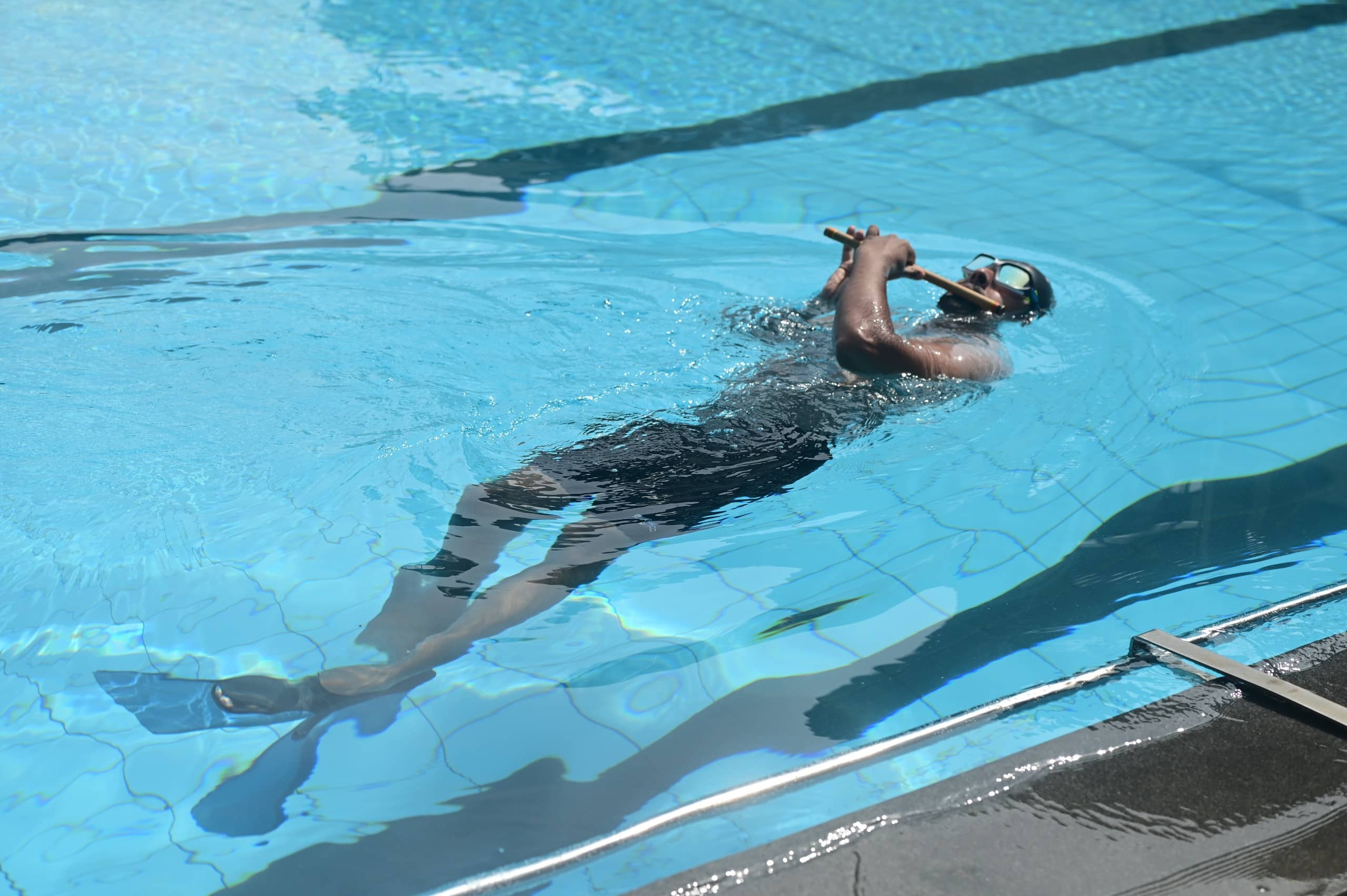 ಮಂಗಳೂರು: ಅನೇಕರಿಗೆ ಕೇವಲ ಈಜುವುದೇ ಕಷ್ಟ, ಅದರಲ್ಲೂ ಕೊಳಲು ನುಡಿಸುತ್ತಾ ಈಜುವುದೆಂದರೆ!?ಇದನ್ನು ಸಾಧಿಸಿ ತೋರಿಸಿದವರು ಮಂಗಳೂರಿನ ಯುವಕ ರೂಬನ್ ಜೇಸನ್ ಮಚಾದೊ. ಕೊಳಲು ನುಡಿಸುತ್ತಾ ಬ್ಯಾಕ್ ಸ್ಟ್ರೋಕ್ ಈಜುತ್ತಾ ಗೋಲ್ಡನ್ ಬುಕ್ ಆಫ್ ವರ್ಲ್ಡ್ ರೆಕಾರ್ಡ್ ದಾಖಲೆ ಸೃಷ್ಟಿಸಿದ್ದಾರೆ. ನಗರದ ಸಂತ ಅಲೋಶಿಯಸ್ ಕಾಲೇಜಿನ ಈಜುಕೊಳ ಈ ಅಪರೂಪದ ದಾಖಲೆಗೆ ಬುಧವಾರ ಸಾಕ್ಷಿಯಾಯಿತು.