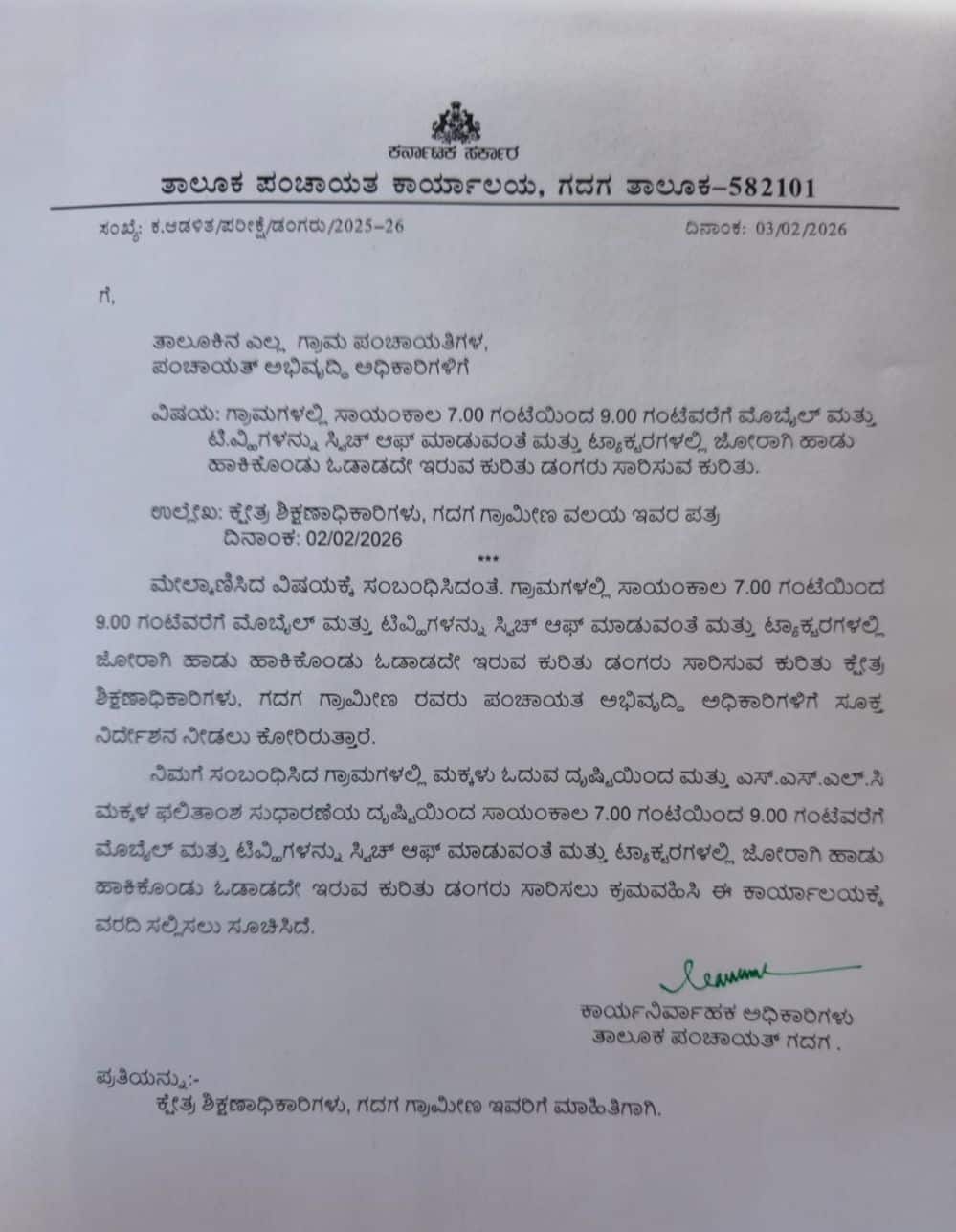 ಪ್ರತಿ ಗ್ರಾಮಗಳಲ್ಲಿ ಸಂಜೆ 7ರಿಂದ ರಾತ್ರಿ 9ರ ವರೆಗೆ ಪ್ರತಿಯೊಬ್ಬರ ಮೊಬೈಲ್ಗಳು, ಪ್ರತಿ ಮನೆಯ ಟಿವಿಗಳು ಸ್ವಿಚ್ ಆಫ್ ಮಾಡುವಂತೆ ಮತ್ತು ಗ್ರಾಮಗಳಲ್ಲಿ ಶಬ್ದಮಾಲಿನ್ಯವಾಗದಂತೆ ಟ್ರ್ಯಾಕ್ಟರ್ಗಳಲ್ಲಿ ಜೋರಾಗಿ ಹಾಡು ಹಾಕಿಕೊಂಡು ಸಂಚಾರ ಮಾಡದಂತೆ ಗದಗ ಗ್ರಾಮೀಣ ಕ್ಷೇತ್ರ ಶಿಕ್ಷಣಾಧಿಕಾರಿಗಳು, ಗದಗ ತಾಪಂ ಕಾರ್ಯಾಲಯಕ್ಕೆ ಮನವಿ ಮಾಡಿದ್ದು, ಮನವಿಗೆ ಸ್ಪಂದಿಸಿದ ತಾಪಂ ಕಾರ್ಯನಿರ್ವಾಹಕ ಅಧಿಕಾರಿಗಳು ಪ್ರತಿ ಗ್ರಾಮ ಪಂಚಾಯಿತಿಗಳಲ್ಲಿ ಈ ಬಗ್ಗೆ ಡಂಗೂರ ಸಾರಲು ಕ್ರಮ ವಹಿಸಬೇಕೆಂದು ಮನವಿ ಸಲ್ಲಿಸಿದೆ.ಮಕ್ಕಳ ಓದಿಗೆ ಹಲವು ಅಡಚಣೆ: ಮಕ್ಕಳು ಓದಿಗೆ ಹಲವಾರು ಅಡಚಣೆಗಳು ಎದುರಾಗುತ್ತಿರುವುದು ಗಂಭೀರ ಚಿಂತನೆಯ ವಿಷಯವಾಗಿದೆ. ಮೊಬೈಲ್ ಹಾಗೂ ಡಿಜಿಟಲ್ ಮಾಧ್ಯಮಗಳ ಅತಿಯಾದ ಬಳಕೆ ಮಕ್ಕಳಲ್ಲಿ ಓದುವ ಆಸಕ್ತಿಯನ್ನೇ ಕಡಿಮೆಯಾಗಿಸಿ, ಪ್ರತಿಕೂಲ ಪರಿಣಾಮ ಬೀರುತ್ತಿದೆ. ಮನೆಗಳಲ್ಲಿ ಪಾಲಕರು ಸಂಜೆ ಮಕ್ಕಳು ಓದುವ ಸಮಯದಲ್ಲಿ ಟಿವಿಗಳಲ್ಲಿ ಧಾರಾವಾಹಿ, ಮೊಬೈಲ್ಗಳಲ್ಲಿ ರೀಲ್ಸ್, ಯುಟ್ಯೂಬ್ ನೋಡುತ್ತಾ ಕುಳಿತುಕೊಂಡಿರುತ್ತಾರೆ, ಮಕ್ಕಳ ಗಮನ ಓದುವುದನ್ನು ಬಿಟ್ಟು, ಮೊಬೈಲ್, ಟಿವಿಗಳ ಮೇಲೆ ಬೀಳುತ್ತಿದೆ. ಇದರಿಂದ ಮಕ್ಕಳು ದೀರ್ಘಕಾಲ ಏಕಾಗ್ರತೆಯಿಂದ ಓದುವ ಅಭ್ಯಾಸವನ್ನು ಕಳೆದುಕೊಳ್ಳುತ್ತಿದ್ದಾರೆ.