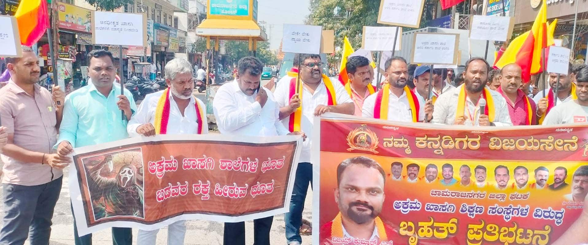 ಜಿಲ್ಲೆಯಲ್ಲಿ ಅಕ್ರಮವಾಗಿ ನಡೆಸುತ್ತಿರುವ ಖಾಸಗಿ ಶಾಲೆಗಳ ವಿರುದ್ಧ ಕ್ರಮ ಜರುಗಿಸುವಂತೆ ಆಗ್ರಹಿಸಿ ನಮ್ಮ ಕನ್ನಡಿಗರ ವಿಜಯಸೇನೆ ವತಿಯಿಂದ ನಗರದಲ್ಲಿ ಪ್ರತಿಭಟನೆ ನಡೆಸಲಾಯಿತು.