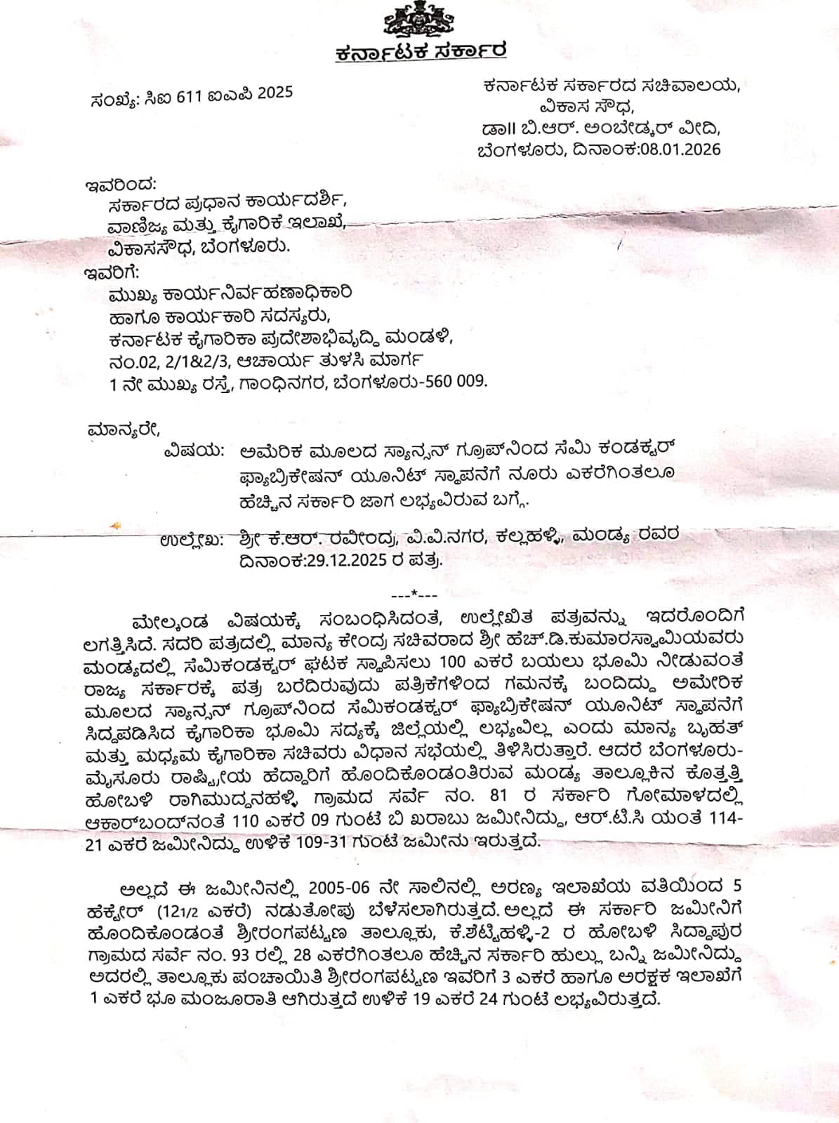 ಅಮೆರಿಕ ಮೂಲದ ಸ್ಯಾನ್ಸನ್ ಗ್ರೂಪ್ನ ಸೆಮಿ ಕಂಡಕ್ಟರ್ ಫ್ಯಾಬ್ರಿಕೇಷನ್ ಯೂನಿಟ್ ಸ್ಥಾಪನೆಗೆ ನೂರು ಎಕರೆಗಿಂತಲೂ ಹೆಚ್ಚಿನ ಸರ್ಕಾರಿ ಜಾಗ ಲಭ್ಯವಿರುವುದಾಗಿ ವಾಣಿಜ್ಯ ಮತ್ತು ಕೈಗಾರಿಕೆ ಇಲಾಖೆ ಸರ್ಕಾರದ ಪ್ರಧಾನ ಕಾರ್ಯದರ್ಶಿಯಿಂದ ಕೆಐಎಡಿಬಿ ಸಿಇಒ ಅವರಿಗೆ ಪತ್ರ ರವಾನಿಸಲಾಗಿದೆ.ಎಚ್.ಡಿ.ಕುಮಾರಸ್ವಾಮಿ ಅವರು ಮಂಡ್ಯದಲ್ಲಿ ಸೆಮಿಕಂಡಕ್ಟರ್ ಘಟಕ ಸ್ಥಾಪನೆಗೆ ೧೦೦ ಎಕರೆ ಬಯಲು ಭೂಮಿ ನೀಡುವಂತೆ ಸರ್ಕಾರಕ್ಕೆ ಪತ್ರ ಬರೆದಿದ್ದು, ಯೂನಿಟ್ ಸ್ಥಾಪನೆಗೆ ಸಿದ್ಧಪಡಿಸಿದ ಕೈಗಾರಿಕಾ ಭೂಮಿ ಲಭ್ಯವಿಲ್ಲವೆಂದು ಬೃಹತ್ ಮತ್ತು ಮಧ್ಯಮ ಕೈಗಾರಿಕಾ ಸಚಿವರು ತಿಳಿಸಿದ್ದರು.