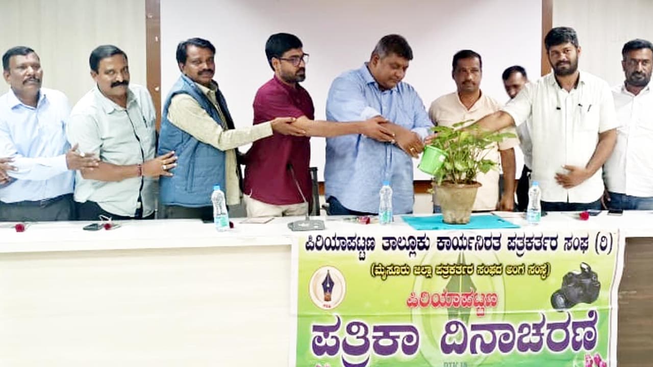 ಪತ್ರಿಕಾ ದಿನಾಚರಣೆಯ ಅಂಗವಾಗಿ ಪತ್ರಕರ್ತರಿಗೆ ಆಶ್ರಯ ಸಮಿತಿ ಅಧ್ಯಕ್ಷ ನಿತಿನ್ ವೆಂಕಟೇಶ್, ಪತ್ರಕರ್ತರಿಗೆ ಉಡುಗೊರೆ ನೀಡಿದರು.ತಾಪಂ ಸಹಾಯಕ ನಿರ್ದೇಶಕ ಕರುಣಾಕರ್, ಜಿಲ್ಲಾ ಪತ್ರಕರ್ತರ ಸಂಘದ ಗ್ರಾಮಾಂತರ ಕಾರ್ಯದರ್ಶಿ ದಾ.ರಾ. ಮಹೇಶ್, ನಿರ್ದೇಶಕ ಹುಲ್ಲಹಳ್ಳಿ ಮೋಹನ್ , ನೇರಳಕುಪ್ಪೆ ಮಹದೇವ್, ಪಿರಿಯಾಪಟ್ಟಣ ತಾಲೂಕು ಕಾರ್ಯನಿರತ ಪತ್ರಕರ್ತರ ಸಂಘದ ಅಧ್ಯಕ್ಷ ಬಿ. ರವಿಚಂದ್ರ, ಪ್ರಧಾನ ಕಾರ್ಯದರ್ಶಿ ಪಿ. ಮಲ್ಲೇಶ್, ಉಪಾಧ್ಯಕ್ಷ ಬಿ.ಎಂ. ಸ್ವಾಮಿ, ಕಾರ್ಯದರ್ಶಿ ಪಿ.ಎನ್. ದೇವೇಗೌಡ , ಜಿಲ್ಲಾ ನಿರ್ದೇಶಕ ಸಿ.ಎನ್. ವಿಜಯ್, ಸದಸ್ಯರಾದ ಕೆ.ಪಿ. ವೆಂಕಟೇಶ, ಕೆ.ಆರ್. ಮಹೇಶ್, ಪಿ.ಡಿ. ಪ್ರಸನ್ನ, ಶರತ್ ಕುಮಾರ್ , ಮುಕುಂದ, ರಾಮೇಗೌಡ, ಲೋಕೇಶ, ಪ್ರಸನ್ನಕುಮಾರ, ಪುನೀತ್, ವಿನಯ್ ಕುಮಾರ್, ಶಿವಣ್ಣ, ಅಶೋಕ, ಎಚ್.ಕೆ. ಮಹೇಶ್, ಸದಾಶಿವ , ಇಂತಿಯಾಜ್ ಅಹಮದ್, ನವೀನ್ ಕುಮಾರ್, ಸತೀಶ್ ಆರಾಧ್ಯ ಇದ್ದರು.