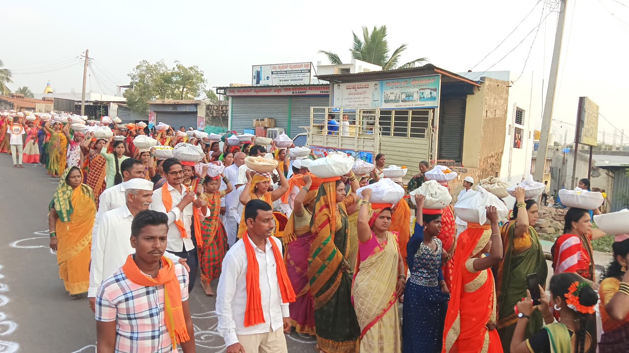 ತೇರದಾಳದಲ್ಲಿ ಅಲ್ಲಮಪ್ರಭು ದೇವಸ್ಥಾನ ಲೋಕಾರ್ಪಣೆ ಅಂಗವಾಗಿ ಜರುಗುತ್ತಿರುವ ಅನ್ನಪ್ರಸಾದ ಸೇವೆಗೆ ತೇರದಾಳದ ಸಾವಿರಾರು ಮಹಿಳೆಯರು ಶೇಂಗಾ ಹೋಳಿಗೆ ತಯಾರಿಸಿ, ಪಾದಯಾತ್ರೆ ಮೂಲಕ ತಲೆ ಮೇಲೆ ಹೊತ್ತು ದೇವಸ್ಥಾನಕ್ಕೆ ಸಮರ್ಪಿಸಿದರು.