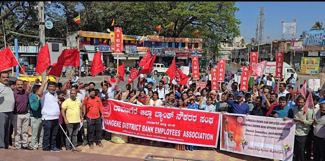 -12ಕೆಡಿವಿಜಿ3: ದಾವಣಗೆರೆಯಲ್ಲಿ ಗುರುವಾರ ಕೇಂದ್ರ ಸರ್ಕಾರದ ವಿರುದ್ಧ ಕರ್ನಾಟಕ ಪ್ರದೇಶ ಬ್ಯಾಂಕ್ ಎಂಪ್ಲಾಯೀಸ್ ಫೆಡರೇಶನ್, ಜಿಲ್ಲಾ ಬ್ಯಾಂಕ್ ನೌಕರರ ಸಂಘದಿಂದ ಪ್ರತಿಭಟಿಸಲಾಯಿತು.