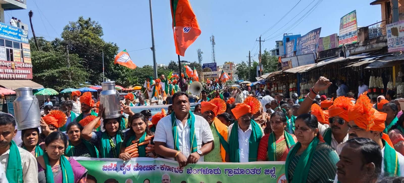ನಗರಸಭೆ ವ್ಯಾಪ್ತಿಯ ವೀವರ್ಸ್ ಕಾಲೋನಿಯ ಶ್ರೀ ಚೌಡೇಶ್ವರಿ ದೇವಾಲಯ ಮುಂಭಾಗದಲ್ಲಿ ಬಿಜೆಪಿ ರೈತರ ಮೋರ್ಚಾ ನೇತೃತ್ವದಲ್ಲಿ ಸಮಾವೇಶಗೊಂಡು ನೂರಾರು ಮಂದಿ ರೈತರು ಮತ್ತು ಬಿಜೆಪಿ ಕಾರ್ಯಕರ್ತರು ಹಾಗೂ ಮುಖಂಡರು ಮೆರವಣಿಗೆ ನಡೆಸಿದರು. ಮೆರವಣಿಗೆಯಲ್ಲಿ ಕಾಂಗ್ರೆಸ್ ಸರ್ಕಾರ ವಿರುದ್ದ ಘೋಷಣೆ ಕೂಗಿ ಆಕ್ರೋಶ ವ್ಯಕ್ತಪಡಿಸಿದರು.ಎತ್ತಿನ ಗಾಡಿ ಹಾಗೂ ಟ್ಯಾಕ್ಟರ್ ರ್ಯಾಲಿ: ಪ್ರತಿಭಟನೆ ಹಿನ್ನಲೆ ಚೌಡೇಶ್ವರಿ ದೇವಾಲಯದಿಂದ ನಗರದ ತಾಲೂಕು ಕಚೇರಿವರೆಗೂ ಸುಮಾರು 10 ಎತ್ತಿನ ಗಾಡಿ ಹಾಗೂ 10 ಟ್ಯಾಕ್ಟರ್ಗಳು ಮೂಲಕ ನಗರದ ಮುಖ್ಯರಸ್ತೆಯಲ್ಲಿ ರ್ಯಾಲಿ ನಡೆಸಿದ್ದ ಹಿನ್ನಲೆ ನಗರದ ಮುಖ್ಯರಸ್ತೆ ಟ್ರಾಫಿಕ್ ಉಂಟಾಗಿದ್ದು ವಾಹನ ಸವಾರರು ಪರದಾಡುವ ಸ್ಥಿತಿ ನಿರ್ಮಾಣಗೊಂಡಿತ್ತು. ಬಳಿಕ ನಗರ ಪೊಲೀಸ್ ಠಾಣೆ ಆರಕ್ಷಕ ನಿರೀಕ್ಷಕ ಭರತ್ಗೌಡ ನೇತೃತ್ವದ ಪೊಲೀಸ್ ಸಿಬ್ಬಂದಿಗಳು ಟ್ರಾಫಿಕ್ ನಿಯಂತ್ರಿಸಿ ಸುಗಮ ಸಂಚಾರಕ್ಕೆ ಅನುವು ಮಾಡಿಕೊಟ್ಟರು.