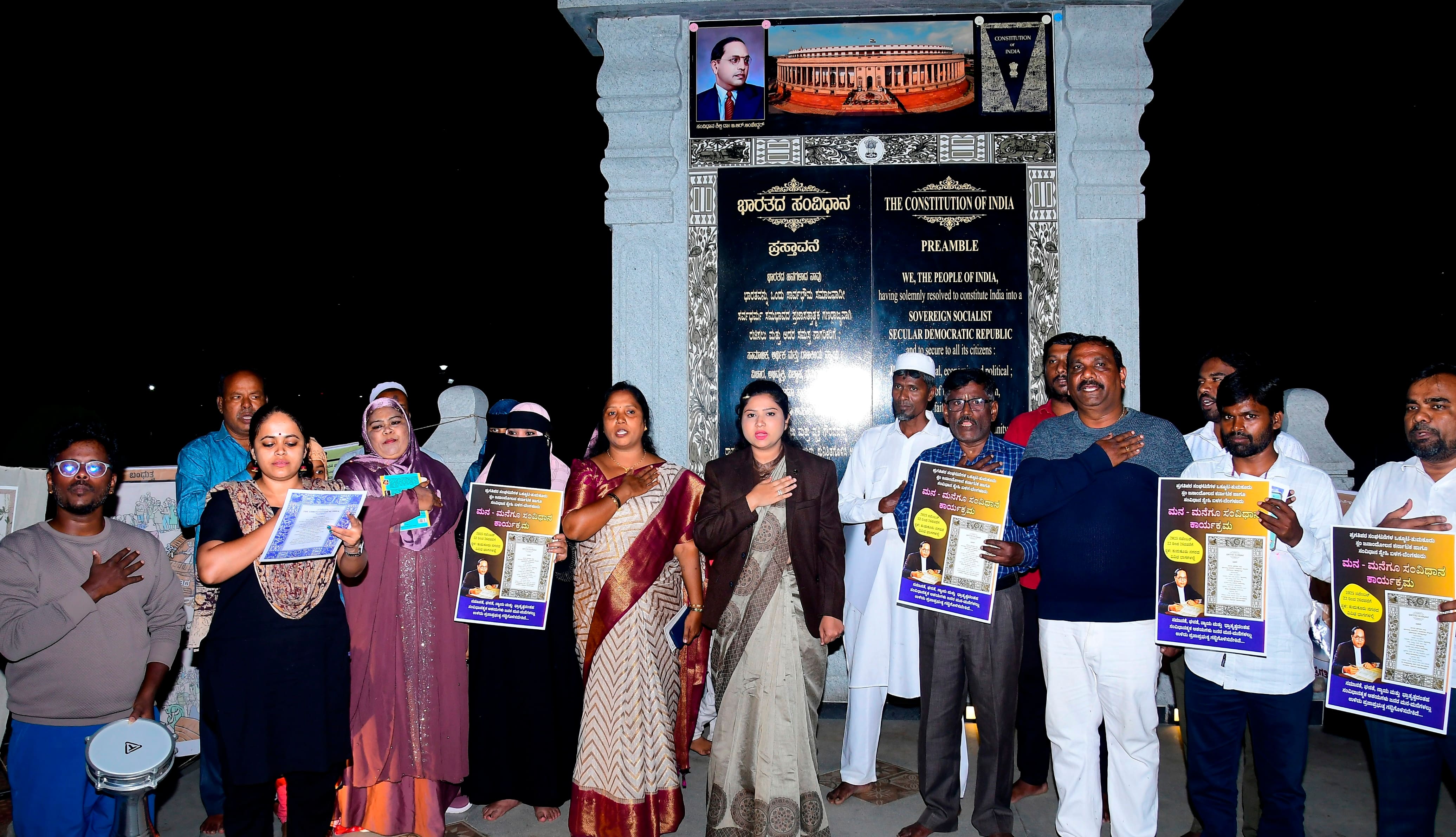 ಸಂವಿಧಾನ ಸ್ನೇಹಿ ಬಳಗದ ವಿನಯ್ ಶ್ರೀನಿವಾಸ್ ಮಾತನಾಡಿ, ಸಂವಿಧಾನವನ್ನು ಬದಲಾಯಿಸದಿದ್ದರು ಸಂವಿಧಾನದಲ್ಲಿರುವ ಅಂಶಗಳನಿಟ್ಟುಕೊಂಡು ಬಲಪಂಥೀಯ ಸಿದ್ದಾಂತವುಳ್ಳ ಸರ್ಕಾರಗಳು ಅದರ ವಿರುದ್ಧವಾಗಿ ಕಾನೂನುಗಳನ್ನು ಮಾಡಿ ನ್ಯಾಯಗಳಿಂದ ಮತ್ತು ಆಯೋಗಗಳಿಂದ ಒಪ್ಪಿಸುವ ಕೆಲಸ ಮಾಡುತ್ತಿವೆ. ತಾಜಾ ಉದಾಹರಣೆ ಎಸ್ಐಆರ್ ಆಗಿದೆ. ಆದ್ದರಿಂದ ಸಂವಿಧಾನದ ಮುಖಾಂತರ ಪ್ರಜಾಪ್ರಭುತ್ವ ವ್ಯವಸ್ಥೆಯನ್ನು ಉಳಿಸುವ ಹಾಗೂ ಪ್ರೀತಿಯನ್ನು ಬಿತ್ತುವ ಕೆಲಸವನ್ನು ಮಾಡಲಾಗುತ್ತಿದೆ ಎಂದರು. ವೇದಿಕೆಯಲ್ಲಿ ಸಾಹಿತಿ ಜನಾರ್ಧನ್ ಕೆಸರುಗದ್ದೆ, ಪ್ರಗತಿರ ಸಂಘಟನೆಗಳ ಒಕ್ಕೂಟದ ಎ.ನರಸಿಂಹಮೂರ್ತಿ ತಾಜುದ್ದೀನ್ ಷರೀಫ್, ಸಾವಿತ್ರಿಬಾಪುಲೆ ಮಹಿಳಾ ಸಂಘಟನೆಯ ಅನುಪಮಾ, ತುಮಕೂರು ಸ್ಲಂ ಸಮಿತಿಯ ತಿರುಮಲಯ್ಯ, ಶಂಕ್ರಯ್ಯ, ಕೃಷ್ಣಮೂರ್ತಿ, ಅರುಣ್, ಮುಬಾರಕ್, ಸಂವಿಧಾನ ಸ್ನೇಹಿ ಬಳಗದ ಅಶ್ವಿನಿಬೋದ್, ಪೂರ್ಣರವಿಶಂಕರ್, ಮನೋಜ್ಕುಮಾರ್, ವಿನೀತ್ಕುಮಾರ್, ಶಿವಕುಮಾರ್, ವೆಂಕಟೇಶ್,ಮೇಘನ, ಭರತ್ ಮುಂತಾದವರು ಪಾಲ್ಗೊಂಡಿದ್ದರು.;Resize=(128,128))
