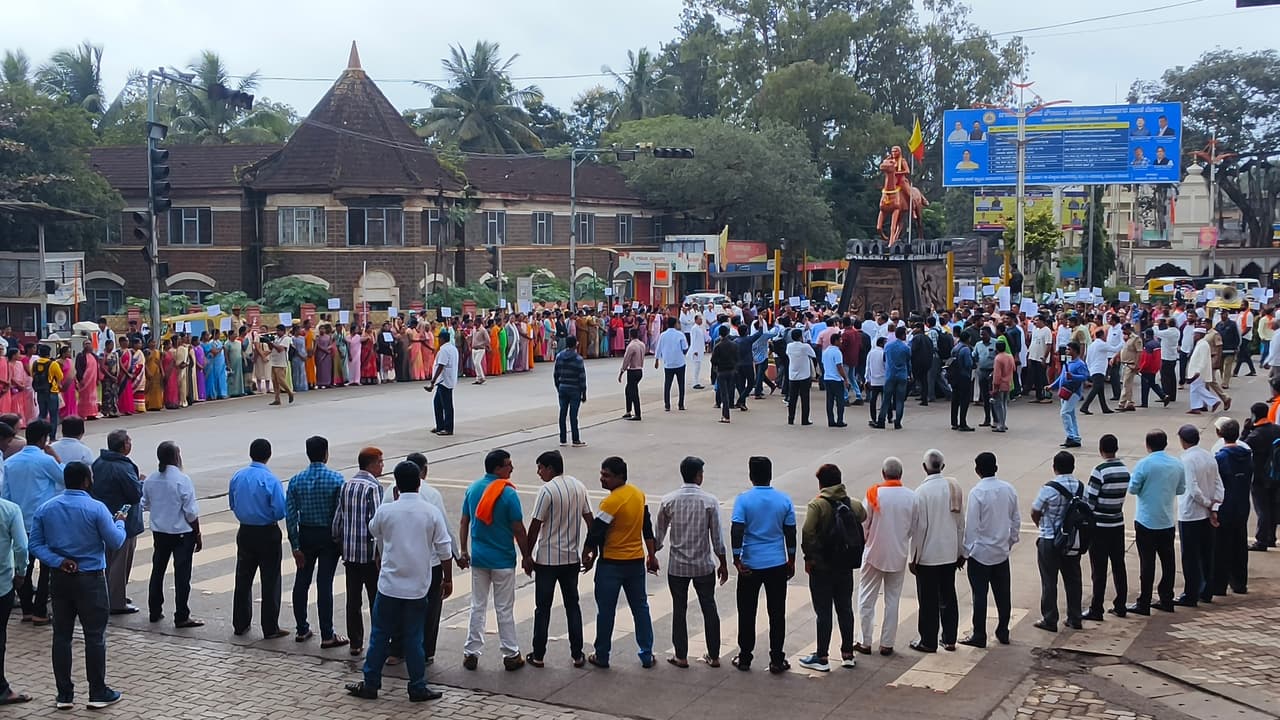 ಶ್ರೀ ಧರ್ಮಸ್ಥಳ ಅಭಿಮಾನಿಗಳ ವೇದಿಕೆ ಹೆಸರಿನಲ್ಲಿ ಪ್ರತಿಭಟನೆ ನಡೆಸಿದ ಭಕ್ತರು ನಗರದ ರಾಣಿ ಚನ್ನಮ್ಮ ವೃತ್ತದಲ್ಲಿ ಮಾನವ ಸರಪಳಿ ನಿರ್ಮಿಸಿ ತಮ್ಮ ಆಕ್ರೋಶ ಹೊರ ಹಾಕಿದರು. ಪ್ರತಿಭಟನೆಗೆ ಹಲವು ಸ್ವಾಮೀಜಿಗಳು, ಹಿಂದೂಪರ ಸಂಘಟನೆಗಳು ಸಾಥ್ ಕೊಟ್ಟರು. ಹೆಚ್ಚಿನ ಸಂಖ್ಯೆಯಲ್ಲಿ ಮಹಿಳೆಯರು ಭಾಗಿಯಾಗಿದ್ದರು. ಅದರಲ್ಲಿ ಕೆಲ ಮುಸ್ಲಿಂ ಮಹಿಳೆಯರು ಪ್ರತಿಭಟನೆಯಲ್ಲಿ ಪಾಲ್ಗೊಂಡು ಧರ್ಮಸ್ಥಳದ ಪರ ಧ್ವನಿ ಎತ್ತಿದರು.