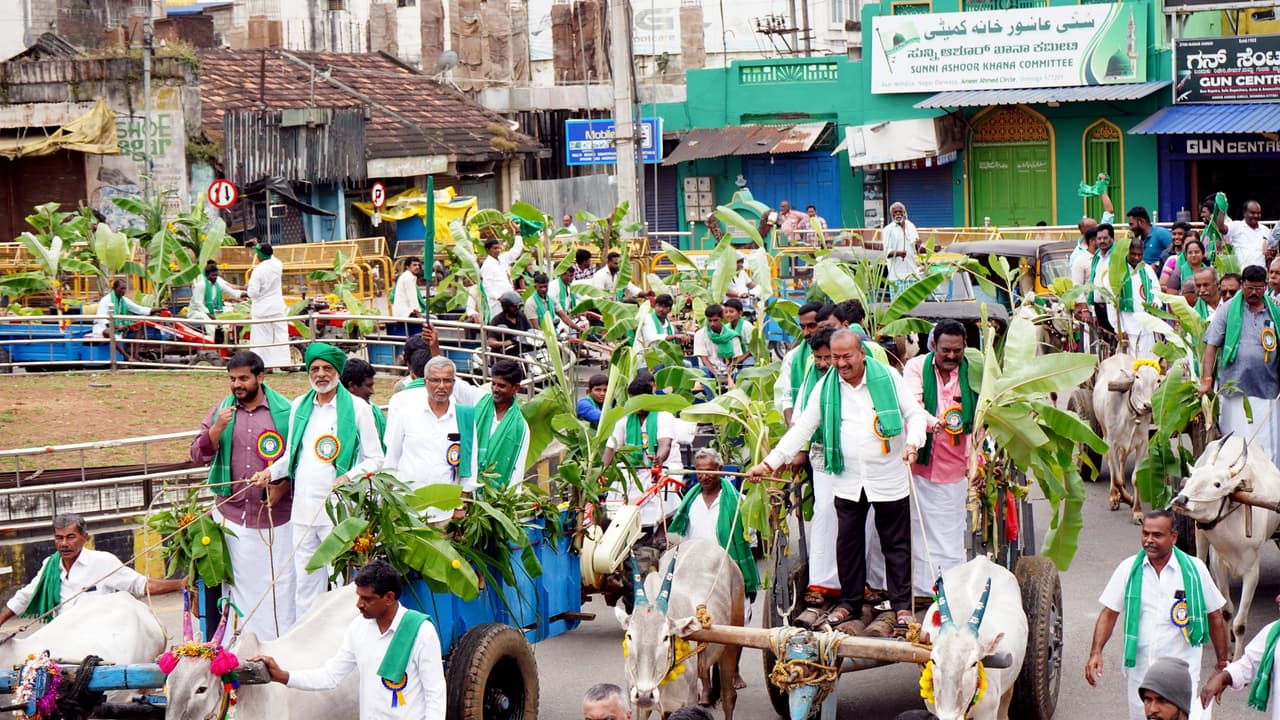 ಮೆರವಣಿಗೆಯಲ್ಲಿ ಪಾಲ್ಗೊಂಡಿದ್ದ ಎತ್ತಿನಗಾಡಿಗಳಿಗೆ ಮಾವಿನ ತೋರಣ, ಬಣ್ಣ, ಬಣ್ಣದ ಕಾಗದ, ಬೆಳೆಕಂದು, ಬಾಳೆಗೊನೆ, ಅಡಿಕೆ, ಹೂವುಗಳಿಂದ ಶೃಂಗರಿಸ ಲಾಗಿತ್ತು. ಎತ್ತುಗಳ ಕೊಂಬುಗಳಿಗೆ ಬಣ್ಣವನ್ನು ಲೇಪಿಸುವುದರ ಜೊತೆಗೆ ಚಿತ್ರಗಳನ್ನು ಬಿಡಿಸಿದ್ದ ಎಲ್ಲರ ಗಮನ ಸೆಳೆಯಿತು.ರೈತ ನಾಯಕರಾದ ಎಚ್.ಆರ್.ಬಸವರಾಜಪ್ಪ, ಶಾಸಕ ಎಸ್.ಎನ್.ಚನ್ನಬಸಪ್ಪ, ಜೆಡಿಎಸ್ ಜಿಲ್ಲಾಧ್ಯಕ್ಷ ಕಡಿದಾಳ ಗೋಪಾಲ್, ಪಾಲಿಕೆ ಮಾಜಿ ಸದಸ್ಯ ಎಚ್.ಸಿ. ಯೋಗೀಶ್ ಸೇರಿ ರೈತ ಮುಖಂಡರು ಎತ್ತಿನ ಗಾಡಿಯಲ್ಲಿ ಬಂದಿದ್ದು ವಿಶೇಷವಾಗಿತ್ತು.