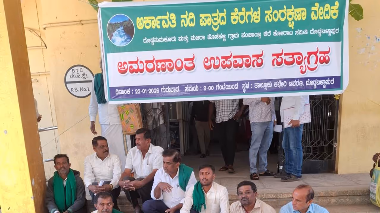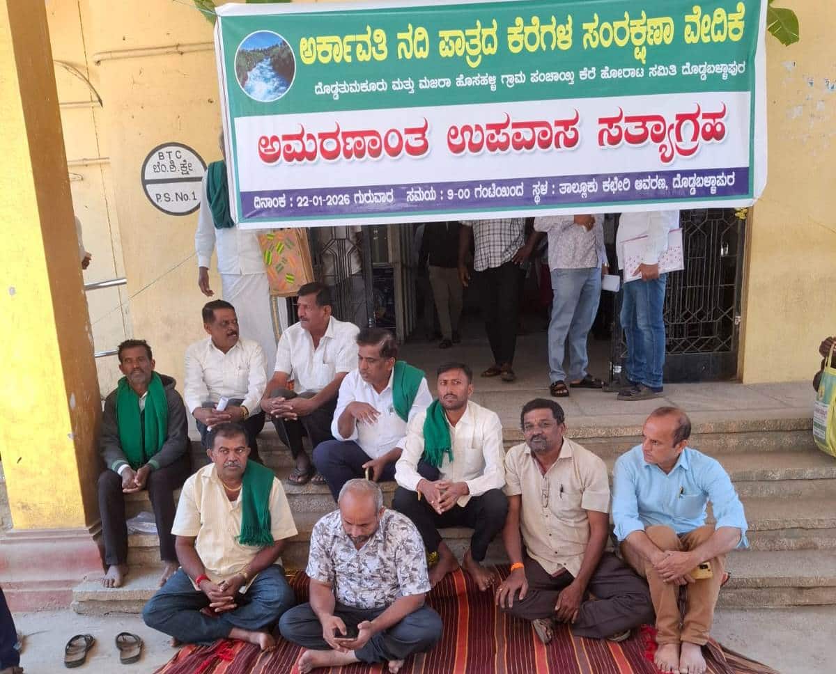 ದೊಡ್ಡಬಳ್ಳಾಪುರ ತಾಲೂಕು ಕಚೇರಿ ಮುಂದೆ ಗುರುವಾರದಿಂದ ಅರ್ಕಾವತಿ ನದಿ ಪಾತ್ರದ ಕೆರೆಗಳ ಸಂರಕ್ಷಣಾ ಸಮಿತಿಯಿಂದ ಆಮರಣಾಂತ ಉಪವಾಸ ಸತ್ಯಾಗ್ರಹ ಆರಂಭವಾಯಿತು.