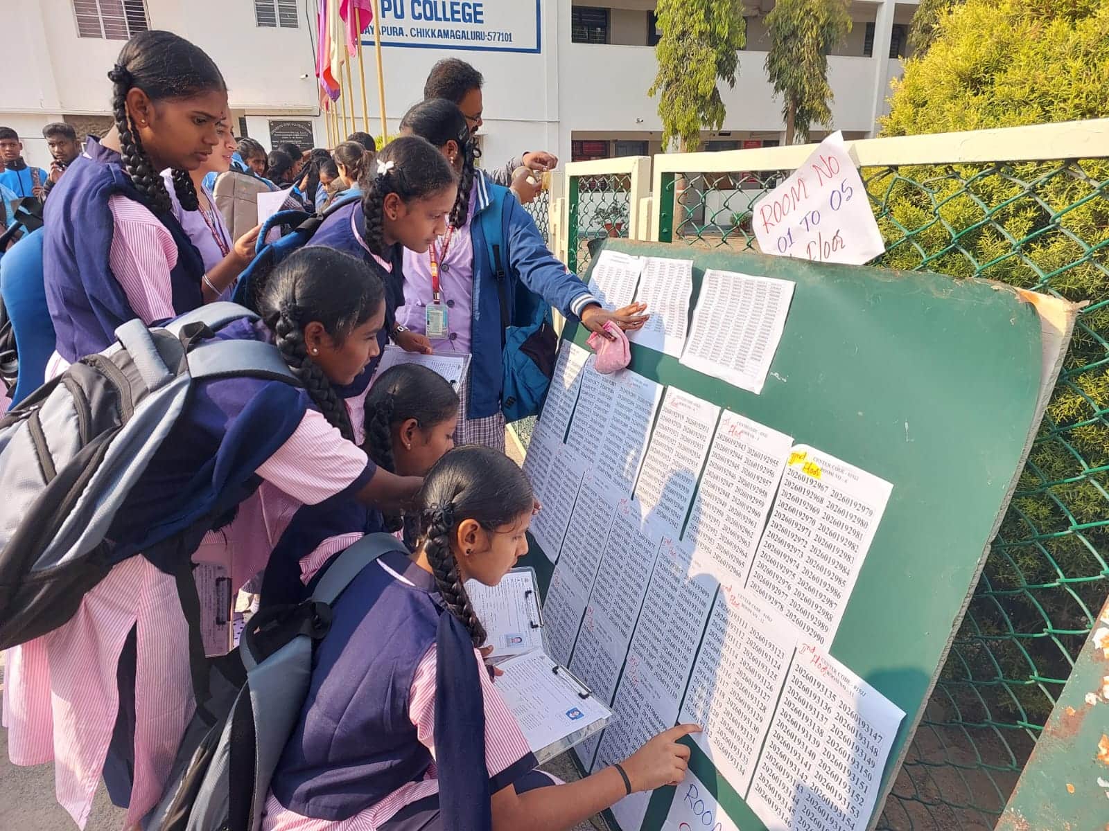 ಚಿಕ್ಕಮಗಳೂರು ನಗರದ ಪರೀಕ್ಷಾ ಕೇಂದ್ರದಲ್ಲಿ ಬುಧವಾರದಿಂದ ಆರಂಭಕ್ಕೂ ಮುನ್ನ ವಿದ್ಯಾರ್ಥಿಗಳು ನೋಂದಣಿ ಸಂಖ್ಯೆ ಪರಿಶೀಲಿಸುತ್ತಿರುವುದು.