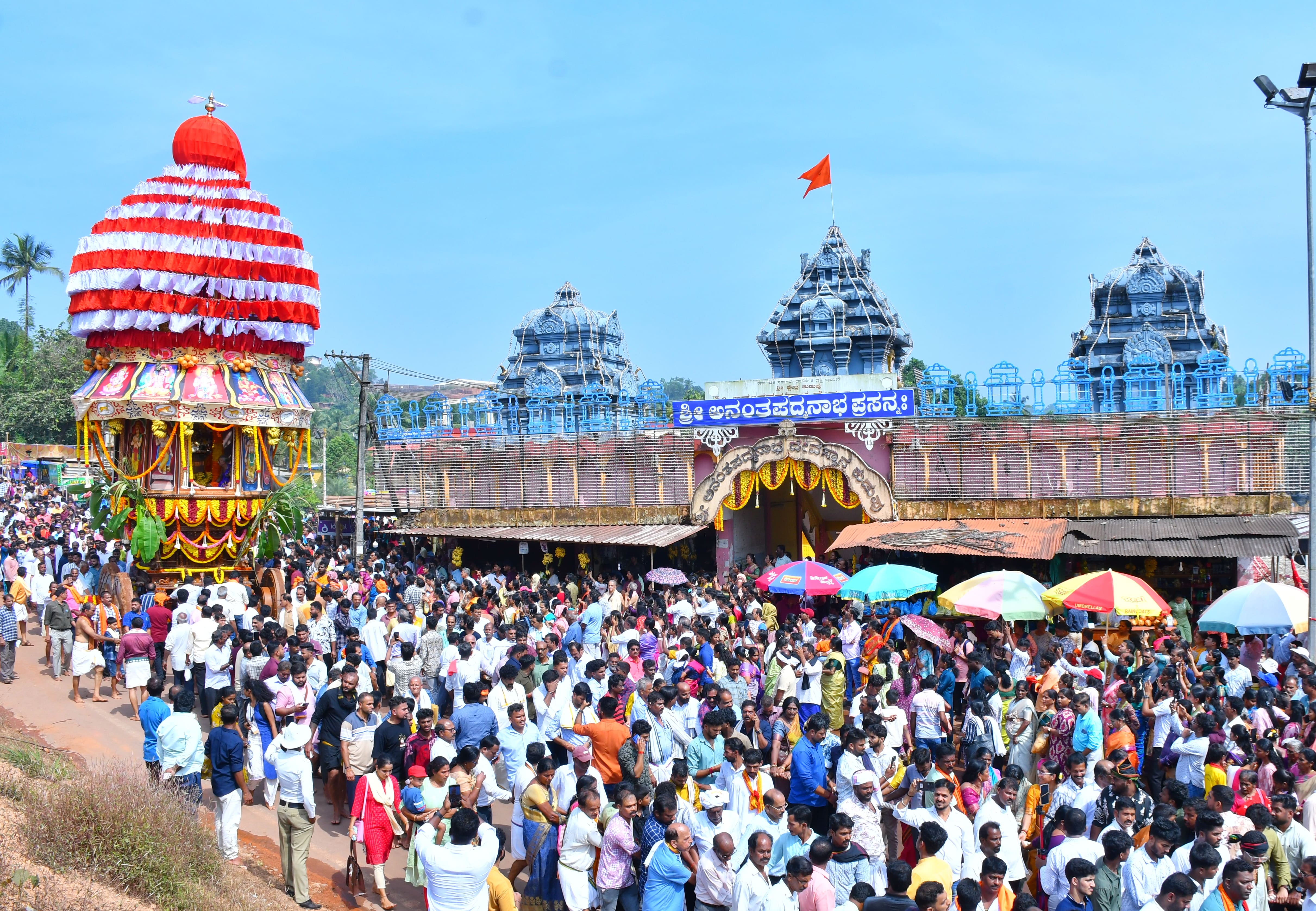ಬಳಿಕ ಪಲ್ಲಪೂಜೆ ನಡೆಸಲಾಯಿತು. ಮಧ್ಯಾಹ್ನ 12 ಗಂಟೆಗೆ ಶ್ರೀ ದೇವರ ಬಲಿ ಹೊರಟು ರಾಜಾಂಗಣದಲ್ಲಿ ವಾದ್ಯ ಸೇವೆಗಳು ನಡೆದ ಬಳಿಕ ರಾಜಬೀದಿಯಲ್ಲಿರುವ ಬ್ರಹ್ಮರಥದ ಬಳಿ ಭಕ್ತರು “ಗೋವಿಂದ” ನಾಮಸ್ಮರಣೆಯ ಘೋಷದೊಂದಿಗೆ ಶ್ರೀ ಅನಂತ ಪದ್ಮನಾಭ ದೇವರ ವೈಭವದ ಬ್ರಹ್ಮ ರಥಾರೋಹಣ ಕಾರ್ಯಕ್ರಮ ನಡೆಯಿತು. ಭಕ್ತರಿಂದ ಬ್ರಹ್ಮರಥಕ್ಕೆ ತೆಂಗಿನಕಾಯಿ ಒಡೆಯುವ ಸೇವೆ ನಡೆದು, ಬ್ರಹ್ಮರಥದಲ್ಲಿ ದೇವರಿಗೆ ವಿಶೇಷ ಮಹಾಪೂಜೆ ನಡೆಯಿತು. ನಂತರ ಬ್ರಹ್ಮರಥವು ರಾಜಬೀದಿಯಲ್ಲಿ ಸಾಗುತ್ತಿದ್ದಾಗ ಭಕ್ತರ “ಗೋವಿಂದ” ನಾಮಸ್ಮರಣೆ ಮುಗಿಲು ಮುಟ್ಟಿತು. ಬಳಿಕ ಮಹಾ ಅನ್ನಸಂಪರ್ಪಣೆಯ ಕಾರ್ಯಕ್ರಮ ನಡೆಯಿತು.ಸಹಸ್ರಾರು ಮಂದಿ ಭಾಗಿ: ಮಹಾ ಅನ್ನಸಂತರ್ಪಣೆಯಲ್ಲಿ 25 ಸಾವಿರಕ್ಕೂ ಹೆಚ್ಚು ಭಕ್ತರು ಅನ್ನ ಪ್ರಸಾದ ಸ್ವೀಕರಿಸಿದರು. ಭಕ್ತರಿಂದ 22 ಸಾವಿರ ತಂಬಿಲ, 600 ಪಂಚಾಮೃತ ಅಭಿಷೇಕ 30 ಸಾವಿರ ಸೀಯಾಳ ಅರ್ಪಣೆಗೊಂಡಿತು.