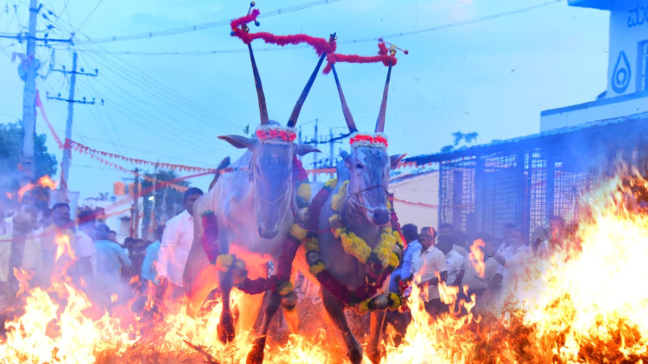 ಗೋವುಗಳಿಗೆ ಗೋಗ್ರಾಸ-ಇಂಡಿ ಬೂಸಾ ಪ್ರಸಾದ ವಿತರಣೆ:ತಾಲೂಕು ಪಣಕನಹಳ್ಳಿಯಲ್ಲಿ ಶ್ರೀಭೈರವೇಶ್ವರ ದೇವಾಲಯ ಆವರಣದಲ್ಲಿ ಕಿಚ್ಚು ಹಾಯಿಸುವುದಕ್ಕೆ ಮುಂಚಿತವಾಗಿ ರಾಸುಗಳಿಗೆ ಸಾಮೂಹಿಕವಾಗಿ ಗೋಗ್ರಾಸ (ಎಳ್ಳು, ಬೆಲ್ಲ, ಕಾಯಿ, ಇಂಡಿ-ಬೂಸಾ, ರವೆ) ಪ್ರಸಾದ ವಿತರಿಸಲಾಯಿತು.