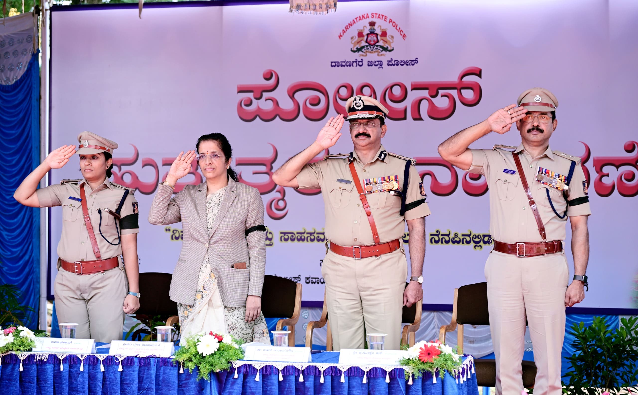 -21ಕೆಡಿವಿಜಿ1.ಜೆಪಿಜಿ:ದಾವಣಗೆರೆ ಜಿಲ್ಲಾ ಪೊಲೀಸ್ ಕವಾಯಿತು ಮೈದಾನದಲ್ಲಿ ಪೊಲೀಸ್ ಹುತಾತ್ಮರ ಸ್ಮಾರಕಕ್ಕೆ ನ್ಯಾಯಾಧೀಶರಾದ ವೇಲಾ ದಾಮೋದರ ಕೆ., ಐಜಿಪಿ ಡಾ.ಬಿ.ಆರ್.ರವಿಕಾಂತೇಗೌಡ, ಎಸ್ಪಿ ಉಮಾ ಪ್ರಶಾಂತ, ಎಎಸ್ಪಿ ಪರಮೇಶ್ವರ ಹೆಗಡೆ ಗೌರವ ಗೌರವ ಸಮರ್ಪಿಸಿದರು. -21ಕೆಡಿವಿಜಿ2, 3: ದಾವಣಗೆರೆ ಜಿಲ್ಲಾ ಪೊಲೀಸ್ ಕವಾಯಿತು ಮೈದಾನದಲ್ಲಿ ಪೊಲೀಸ್ ಹುತಾತ್ಮರ ಸ್ಮಾರಕಕ್ಕೆ ನ್ಯಾಯಾಧೀಶರಾದ ವೇಲಾ ದಾಮೋದರ ಕೆ. ಗೌರವ ಸಮರ್ಪಿಸಿದರು.