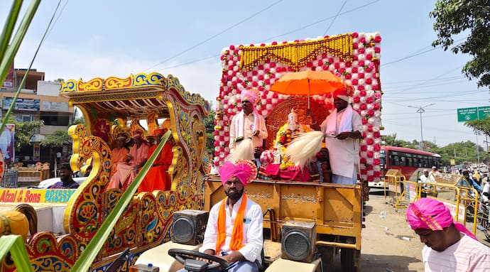 ಪಟ್ಟಣದ ಶಾಂತೇಶ್ವರ ದೇವಸ್ಥಾನದಿಂದ ಸಿದ್ಧಾರೂಢರ ಮೂರ್ತಿಯನ್ನು ತೆರೆದ ವಾಹನದಲ್ಲಿ ಮೆರವಣಿಗೆ ನಡೆಸಲಾಯಿತು. ಈ ವೇಳೆ ಕುಂಭ ಹೊತ್ತ ಮಹಿಳೆಯರು, ಯುವಕರು ಹೆಜ್ಜೆ ಹಾಕಿದರು. 55 ಜೋಡಿ ಎತ್ತಿನ ಗಾಡಿ, ಡೋಲು, ಡೊಳ್ಳು, ವೀರಗಾಸೆ, ಪುರವಂತರ ತಂಡ, ಚೆಟ್ಟಿ ಮೇಳ, ಬೃಹತ್ ಗೊಂಬೆಗಳಲ್ಲದೇ, ಬ್ಯಾಂಡ್ ಬಾಜಾ ಸೇರಿ ಸಕಲ ವಾದ್ಯಗಳೊಂದಿಗೆ ಸಿದ್ಧಾರೂಢರ ಮೂರ್ತಿಯನ್ನು ಅದ್ಧೂರಿ ಮೆರವಣೆಗೆ ಮಾಡಲಾಯಿತು.ಮೂರ್ತಿಯನ್ನು ಕಂಡು ಭಕ್ತರು ಮೆರವಣಿಗೆಯ ಮೇಲೆ ಪುಷ್ಪವೃಷ್ಟಿಗೈದರು. ಕುಂಭ ಹೊತ್ತ, ಗ್ರಂಥ ತಲೆಯಲ್ಲಿ ಇಟ್ಟುಕೊಂಡಿದ್ದ ಭಕ್ತರು ಹೆಜ್ಜೆ ಹಾಕುತ್ತಿದ್ದರೆ ಓಂ ನಮಃ ಶಿವಾಯ ಎಂಬ ಮಂತ್ರ ಅಂತಃಶಕ್ತಿಯನ್ನು ಹೊರಹೊಮ್ಮಿಸುತ್ತಿತ್ತು. ಅಜ್ಜನ ಭಜನೆಗಳು ಆಯಾಸವನ್ನು ಮರೆಸುತ್ತಿದ್ದವು. ಬರೋಬ್ಬರಿ 4 ಗಂಟೆಗೂ ಅಧಿಕ ಕಾಲ ಮೆರವಣಿಗೆ ನಡೆಯಿತು. ಪಟ್ಟಣದ ಸಿದ್ಧಲಿಂಗ ದ್ವಾರ ಬಾಗಿಲದವರಿಗೆ ಮೆರವಣೆಗೆ ಬಂದು ತಲುಪಿತು. ನಂತರ ಆಳೂರ ಗ್ರಾಮಕ್ಕೆ ಕುಂಭ ಮೆರವಣಿಗೊಂದಿಗೆ ಸಿದ್ಧಾರೂಢರ ಮಠಕ್ಕೆ ಮೆರವಣಿಗೆ ತಲುಪಿತು. ಈ ಸಂದರ್ಭದಲ್ಲಿ ಆಳೂರ ಮಠದ ಶಂಕರಾನಂದ ಮಹಾಸ್ವಾಮಿಗಳು, ಸ್ವರೂಪನಂದ ಶ್ರೀಗಳು, ಕಾಸುಗೌಡ ಬಿರದರ, ದಯಸಾಗರ ಪಾಟೀಲ, ಅನಿಲಪ್ರಸಾದ ಏಳಗಿ, ಅನಿಲಗೌಡ ಬಿರಾದಾರ, ಗದಗದ ಪರಿಪೂರ್ಣ ಆನಂದ ಭಾರತಿ ಶ್ರೀಗಳು, ಬಸುಗೌಡ ಪಾಟೀಲ, ಗುರುಪಾದ ವಾಡಿ, ಪಾಂಡುರಂಗ ಕುಲಕರ್ಣಿ, ಹೋನ್ನಪ್ಪಗೌಡ ಪಾಟೀಲ, ಸಂತೋಷ ಸದಲಾಪೂರ, ರಮಸಿಂಗ್ ಕನ್ನೊಳ್ಳಿ, ಕಾಂತು ಬಬಲಾದ, ರಮೇಶ ಗುಡೇವಾಡಿ, ಅಣ್ಣಪ್ಪ ವಾಡಿ, ರಾಜು ವಾಲಿಕಾರ, ಬಸವರಾಜ ವಾಲಿಕಾರ, ರಾಜಶೇಖರ ನಾಟೀಕಾರ, ಸುರೇಶ ನಾಟೀಕಾರ, ಅಪ್ಪು ಮಾವಿನಹಳ್ಳಿ ಇದ್ದರು.
