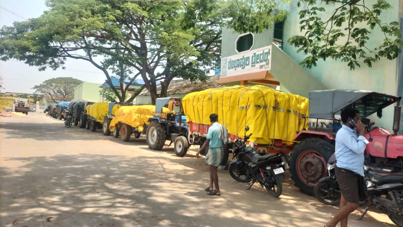 ಕೊಟ್ಟೂರು: ಸರ್ಕಾರ ಕೊಟ್ಟೂರಿನಲ್ಲಿ ರಾಗಿ ಬೆಂಬಲ ಬೆಲೆಯ ಖರೀದಿ ಕೇಂದ್ರ ಆರಂಭಿಸಿದೆಯಾದರೂ ರೈತರು ಮಾರಾಟಕ್ಕೆ ತರುತ್ತಿರುವ ರಾಗಿ ಟ್ರ್ಯಾಕ್ಟರ್ಗಳ ಸಾಲು ದಿನದಿನಕ್ಕೂ ನೂರಾರು ಮೀಟರ್ಗಳಷ್ಟು ಉದ್ದವಾಗುವ ಮೂಲಕ ರೈತರನ್ನು ಬಸವಳಿಯುವಂತೆ ಮಾಡಿದೆ.ಮೇ 31ರ ವರೆಗೆ ರಾಗಿ ಖರೀದಿ ಕೇಂದ್ರದಲ್ಲಿ ಮಾರಾಟ ಮಾಡಲು ಅವಕಾಶವಿದೆ. ಅಷ್ಟರೊಳಗೆ ಮಾರಾಟ ಮಾಡಿ ಬೆಂಬಲ ಬೆಲೆಯ ಲಾಭ ಪಡೆಯಬೇಕು ಎಂಬ ರೈತರ ಆಶಯ ಈಡೇರುವಂತೆ ಕಾಣುತ್ತಿಲ್ಲ. ಸರ್ಕಾರ ರಾಗಿಗೆ ₹4886 ಬೆಂಬಲ ಬೆಲೆ ಘೋಷಿಸಿದೆ. ಮುಕ್ತ ಮಾರುಕಟ್ಟೆಯಲ್ಲಿ ರಾಗಿ ದರ ಕಡಿಮೆ ಇರುವ ಕಾರಣ ರೈತರು ನಿತ್ಯ ಲೋಡ್ ತುಂಬಿದ ಟ್ರ್ಯಾಕ್ಟರ್ಗಳೊಂದಿಗೆ ಕೊಟ್ಟೂರು ಎಪಿಎಂಸಿ ಆವರಣದಲ್ಲಿ ಜಮಾವಣೆಯಾಗುತ್ತಿದ್ದಾರೆ.