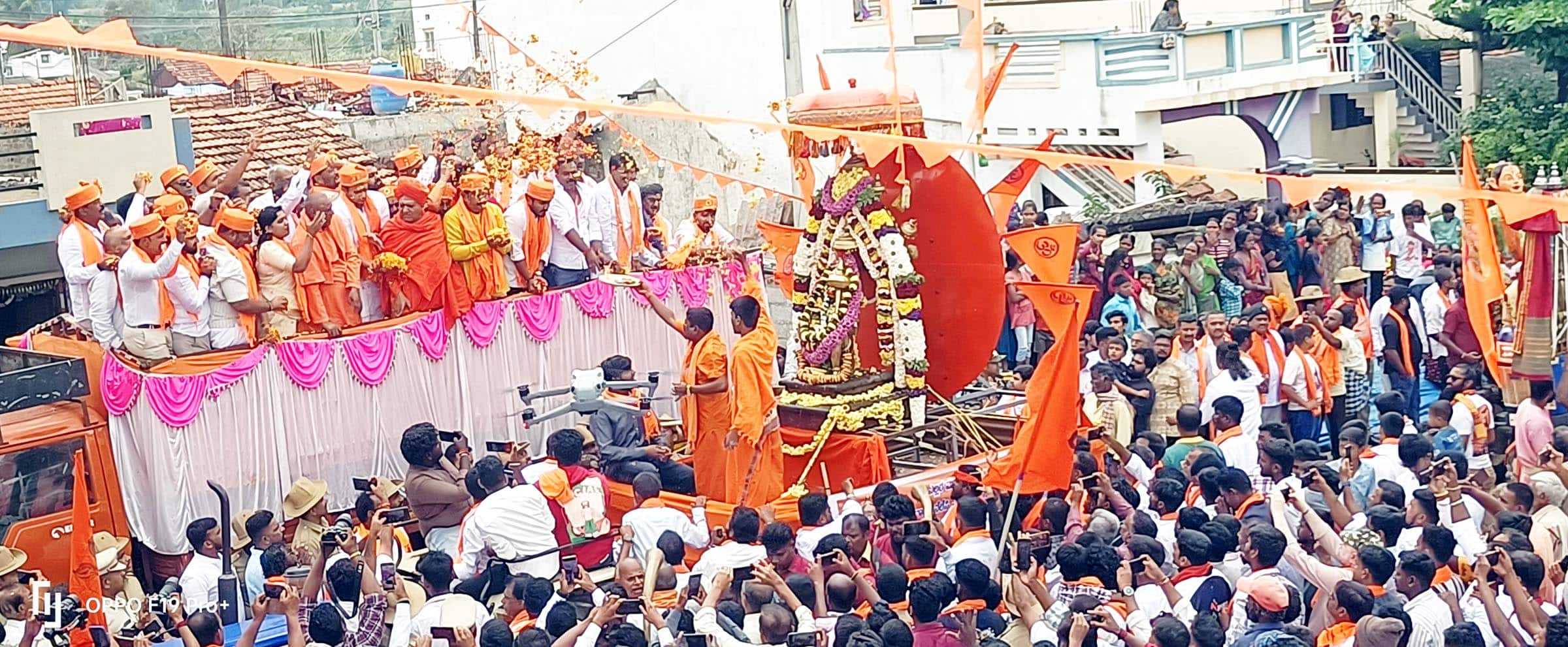 ತೆರೆದ ವಾಹನದಲ್ಲಿ ಜನಪ್ರತಿನಿಧಿಗಳುಮೆರವಣಿಗೆ ಚಾಲನೆ ನೀಡಿದ ನಂತರ ಗಣ್ಯರು ಮತ್ತು ಮಠಾಧೀಶರು ತೆರದ ವಾಹನದಲ್ಲಿ ಮೆರವಣಿಗೆಯಲ್ಲಿ ಸಾಗಿ ಬಂದರು. ನೆರೆದಿದ್ದ ಭಕ್ತಗಣಕ್ಕೆ ಕೈಬೀಸುತ್ತಲೇ ಉತ್ಸವದ ಸಂಭ್ರಮಾಚರಣೆಯನ್ನು ಮಾಡಿಕೊಂಡರು. ಶಾಸಕ ಜಿ.ಡಿ. ಹರೀಶ್ ಗೌಡ ಮೆರವಣಿಗೆ ಅಂತ್ಯದವರೆಗೂ ಇದ್ದರು.-- ಬಾಕ್ಸ್--1-- ನಿರೀಕ್ಷೆಗೂ ಮೀರಿದ ಭಕ್ತಸಾಗರ --ಮಧ್ಯಾಹ್ನ 2 ಗಂಟೆಯಾದರೂ ಮೆರವಣಿಗೆಗೆ ಸೇರಿಕೊಳ್ಳುವ ಉದ್ದೇಶದಿಂದ ಗ್ರಾಮಾಂತರ ಭಾಗಗಳಿಂದ ಯುವಕರ ಪಡೆ ದಂಡುದಂಡಾಗಿ ಬರುತ್ತಿದ್ದು, ಕಾಣಬರುತ್ತಿತ್ತು. ಪಟ್ಟಣದ ಗಡಿಭಾಗಗಳಲ್ಲಿ 6 ಕಡೆಗಳಲ್ಲಿ ಪೊಲೀಸರು ಚೆಕ್ ಪೋಸ್ಟ್ ನಿರ್ಮಿಸಿದ್ದರು. 1500 ಪೊಲೀಸರು ಶಾಂತಿ ಭಂಗವಾದಂತೆ ಕರ್ತವ್ಯ ನಿರ್ವಹಿಸಿದರು. ಪಟ್ಟಣದೊಳಗೆ ಬರುತ್ತಿದ್ದ ಯುವಕರನ್ನು ತಡೆದು ವಿಚಾರಿಸುತ್ತಿದ್ದುದು ಕಂಡುಬಂತು. 10 ಸಾವಿರ ಭಕ್ತರು ಮೆರವಣಿಗೆಯಲ್ಲಿ ಪಾಲ್ಗೊಳ್ಳಬಹುದೆಂಬ ನಿರೀಕ್ಷೆ ಆಯೋಜಕರು ಮತ್ತು ಪೊಲೀಸರು ಹೊಂದಿದ್ದರು. ಆದರೆ ಎಲ್ಲರ ನಿರೀಕ್ಷೆ ಮೀರಿ 25 ಸಾವಿರಕ್ಕೂ ಹೆಚ್ಚು ಭಕ್ತರು ಮೆರವಣಿಗೆಯಲಿ ಪಾಲ್ಗೊಂಡು ಮೆರವಣಿಗೆಯನ್ನು ಅಂದಗಾಣಿಸಿದ್ದು ಎಲ್ಲರ ಮೆಚ್ಚುಗಗೆ ಪಾತ್ರವಾಯಿತು.--ಬಾಕ್ಸ್-- 2---- ಶ್ರೀರಾಮಸ್ಮರಣೆ ಮೊಳಗಿತು --ಮೆರವಣಿಗೆಯಲ್ಲಿ 10ಕ್ಕೂ ಹೆಚ್ಚು ಶ್ರೀ ಆಂಜನೇಯನ ಮೂರ್ತಿಗಳು ಪಾಲ್ಗೊಂಡಿದ್ದವು. ಪಂಚಲೋಹದಿಂದ 5 ಅಡಿ ಎತ್ತರದ ತಯಾರಿಸಿದ ಪವನಸುತನ ಮೂರ್ತಿ, 15 ಅಡಿ ಎತ್ರದ ಬೃಹತ್ ಮೂರ್ತಿಗಳು ಎಲ್ಲರಲ್ಲೂ ಭಕ್ತಿಯ ಪರಾಕಾಷ್ಠೆಯನ್ನು ತಲುಪುವಂತೆ ಮಾಡಿದವು ಶಿವಜ್ಯೋತಿ ನಗರದ ಗರಡಿಮನೆ, ಕಲ್ಕುಣಿಕೆ ನಾಯಕರ ಗರಡಿಮನೆ, ಮುತ್ತುಮಾರಮ್ಮ ಗರಡಿಮನೆಯ ಆಂಜನೇಯಮೂರ್ತಿಗಳು, ದತ್ತಾತ್ರೇಯ ಮೂರ್ತಿ ಮುಂತಾದವುಗಳು ಮೆರವಣಿಗೆಯಲ್ಲಿ ಪಾಲ್ಗೊಂಡಿದ್ದವು. ಕಲ್ಕುಣಿಕೆ ಶ್ರೀರಾಮ ಹುಣಸೂರು ಈವೆಂಟ್ಸ್ ವತಿಯಿಂದ ಇತ್ತೀಚೆಗೆ ಅಯೋಧ್ಯೆಯಲ್ಲಿ ಸ್ಥಾಪನೆಗೊಂಡ ಧರ್ಮಧ್ವಜದ ಸ್ತಬ್ಧಚಿತ್ರ ನೋಡುಗರನ್ನು ಆಕರ್ಷಿಸಿತು. ಅಲ್ಲದೇ ಅಂಜನಾದ್ರಿಬೆಟ್ಟದಲ್ಲಿ ವಿರಾಜಮಾನನಾದ ಆಂಜನೇಯನ ಸ್ಥಬ್ಧಚಿತ್ರವು ಭಕ್ತರನ್ನು ತನ್ನತ್ತ ಸೆಳೆಯುವಲ್ಲಿ ಯಶಸ್ವಿಯಾಯಿತು. ಮೆರವಣಿಗೆಯಲ್ಲಿ ಕೇರಳದ ಚಂಡೆವಾದನ, ಗಾವಡಗೆರೆಯ ಯುವಕತಂಡದಿಂದ ತಮಟೆವಾದನ, ಪಟ್ಟಣದ ಸರಸ್ವತಿಪುರಂನ ಡೊಳ್ಳುಕುಣಿತ, ವೀರಗಾಸೆಕುಣಿತ, ಕೀಲುಕುದುರೆಗಳು, ನವಿಲುನೃತ್ಯ, ಮಂಗಳವಾದ್ಯ ಮೆರವಣಿಗೆಯ ಅಂದವನ್ನು ಇನ್ನಷ್ಟು ಹೆಚ್ಚಿಸುವಲ್ಲಿ ಸಫಲವಾದವು.