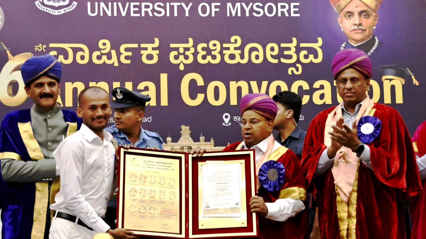 ಕನಕಗಿರಿ : ಮೈಸೂರು ವಿವಿ ಸ್ನಾತಕೋತ್ತರ (ಎಂಎ) ಕನ್ನಡ ವಿಭಾಗದಲ್ಲಿ ತಾಲೂಕಿನ ಕನ್ನೇರಮಡು ಗ್ರಾಮದ ರೈತ ದಂಪತಿಯ ಮಗ 13 ಚಿನ್ನದ ಪದಕ ಹಾಗೂ 4 ನಗದು ಬಹುಮಾನ ಪಡೆದು ಗಮನ ಸೆಳೆದಿದ್ದಾನೆ.