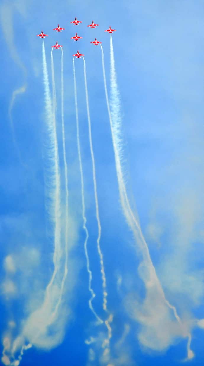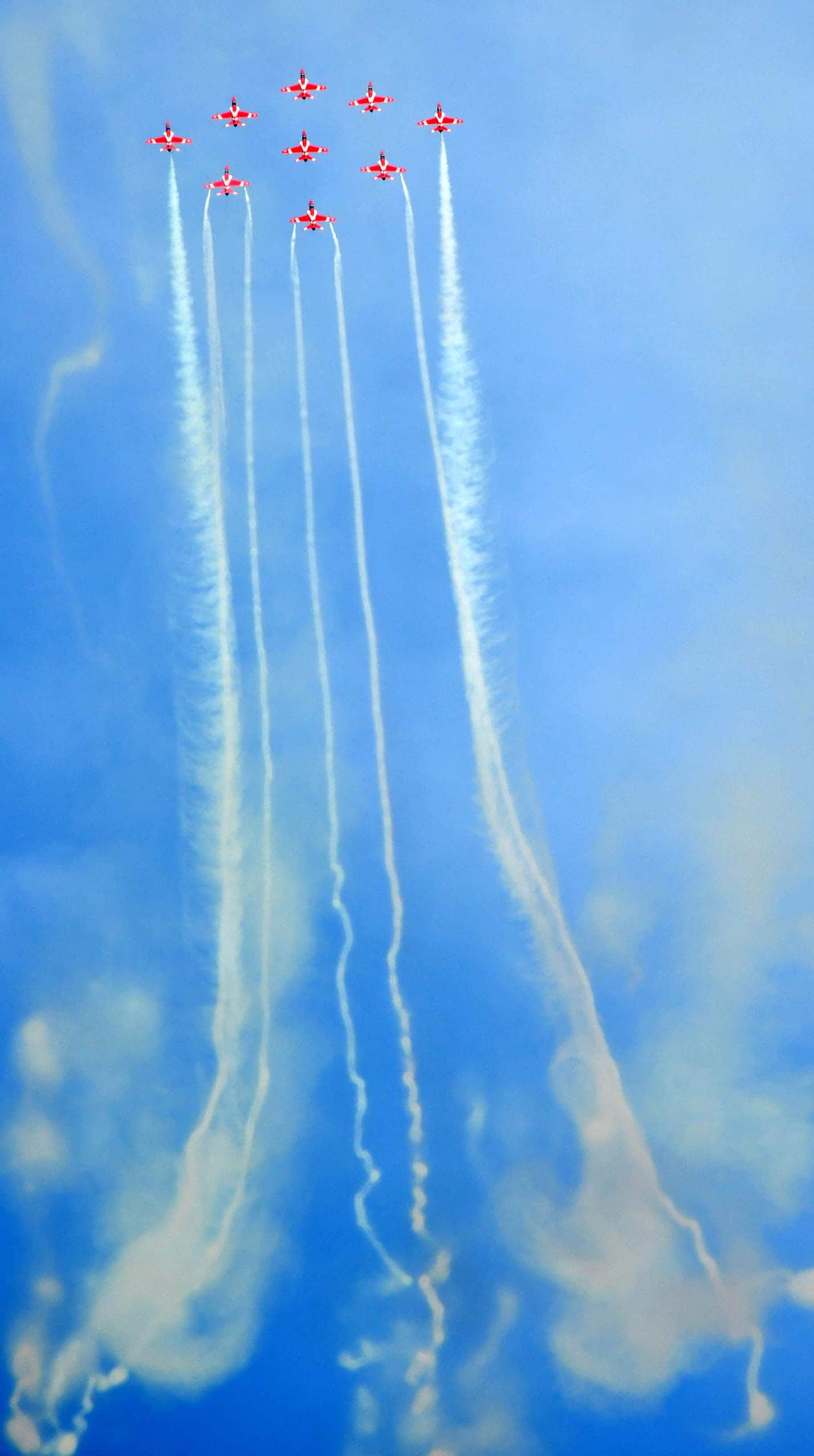 ಬೆಂಗಳೂರಿನ ಯಲಹಂಕ ವಾಯುನೆಲೆಯಿಂದ ಸಂಜೆ 4ಕ್ಕೆ ಮೈಸೂರಿಗೆ ಆಗಮಿಸಿದ 9 ಜೆಟ್ ವಿಮಾನಗಳು ಸಾಹಸಮಯ ಪ್ರದರ್ಶನ ನೀಡಿದವು. ನಾಲ್ಕು ದಿಕ್ಕುಗಳಿಂದಲೂ ಶರವೇಗದಲ್ಲಿ ನುಗ್ಗಿ ಬರುತ್ತಿದ್ದ ವಿಮಾನಗಳು ಸಮನ್ವಯದಿಂದ ಪ್ರದರ್ಶನ ನೀಡಿದವು. ವಿಮಾನಗಳು ಭೂಮಿಯತ್ತ ಧಾವಿಸುವಾಗ ನೆರೆದಿದ್ದ ಪ್ರೇಕ್ಷಕರಿಂದ ಹರ್ಷೋದ್ಘಾರ ಹೊಮ್ಮಿತು.ಆಕಾಶದಲ್ಲಿ ತ್ರಿವರ್ಣ ಧ್ವಜದ ಬಣ್ಣದೊಂದಿಗೆ ಹಾರಾಟ ನಡೆಸಿದಾಗ ನೆರೆದಿದ್ದವರಲ್ಲಿ ದೇಶಭಕ್ತಿಯ ಗೌರವದ ಮೂಡಿಸಿತು. ವಿಜಯದ ಸಂಕೇತ, ಸಿಗ್ನೇಚರ್ ಸ್ಟಂಟ್, ಮೂವರು ವಿಮಾನಗಳ ಸುತ್ತ 2 ವಿಮಾನಗಳು ಚಕ್ರಕಾರದಲ್ಲಿ ಸುತ್ತಿದ ವಿಮಾನಗಳು, ಪ್ರೀತಿಯ ಸಂಕೇತವಾದ ಹೃದಯದ ಚಿತ್ತಾರ ಬಿಡಿಸುವ ಮೂಲಕ ಪ್ರೇಕ್ಷಕರ ಹೃದಯ ಗೆದ್ದಿತು.