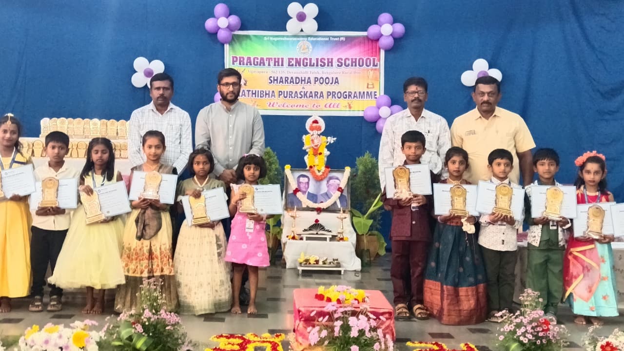 (ಫೋಟೋ ಕ್ಯಾಪ್ಞನ್)ವಿಜಯಪುರದ ಪ್ರಗತಿ ಆಂಗ್ಲ ಶಾಲೆಯ ೨೦೨೫-೨೬ನೇ ಶೈಕ್ಷಣಿಕ ಸಾಲಿನ ಶಾರದಾ ಪೂಜೆ ಹಾಗೂ ಪ್ರತಿಭಾ ಪುರಸ್ಕಾರ ಸಮಾರಂಭದಲ್ಲಿ ಸಂಸ್ಥೆ ವ್ಯವಸ್ಥಾಪಕ ನಿರ್ದೇಶಕ ಡಾ.ಎಸ್.ಕೃಪಾಶಂಕರ್, ಪ್ರಾಂಶುಪಾಲ ಡಾ. ಎನ್. ನಾಗರಾಜ್, ಮುಖ್ಯಶಿಕ್ಷಕ ಜೆ.ಎನ್. ಪ್ರಕಾಶ್ ಇತರರು ಪಾಲ್ಗೊಂಡಿದ್ದರು.