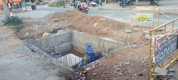 ವೆಂಕಟಾಪುರ ರಸ್ತೆ ಮಾರ್ಗದಲ್ಲಿ ಬೃಹತ್ ವಾಲ್ ಕಾಮಗಾರಿ ನಿರ್ಮಾಣಕ್ಕೆ ರಸ್ತೆ ಪಕ್ಕದಲ್ಲಿಯೆ 15ಅಡಿ ಉದ್ದ ಹಾಗೂ 15ಅಡಿ ಆಳಕ್ಕೆ ಜೆಬಿಸಿಯಿಂದ ಗುಂಡಿ ಬಗೆದು ಕಾಮಗಾರಿ ಸ್ಥಗಿತಗೊಳಿಸಿ ಹಾಗೆ ಬಿಟ್ಟಿದ್ದಾರೆ.