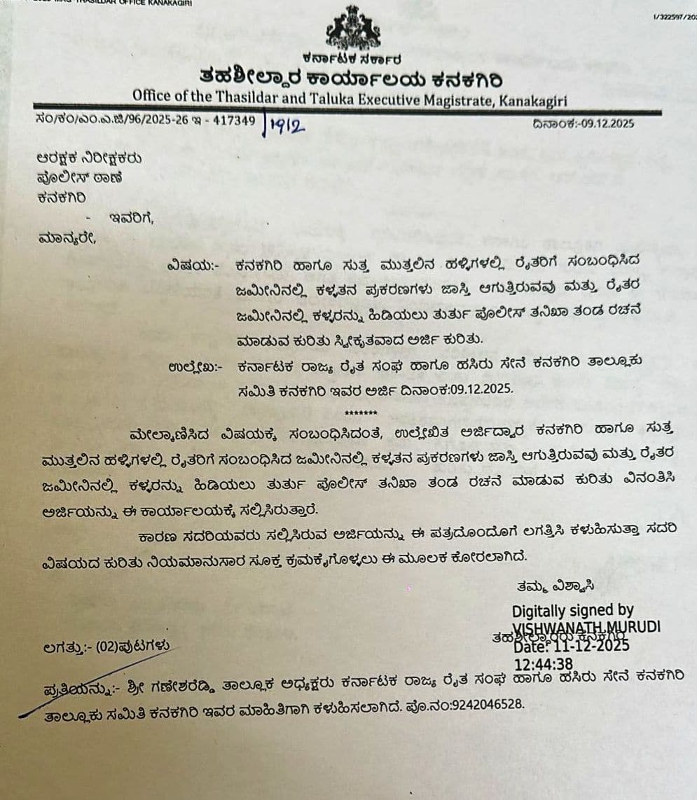 ಕನಕಗಿರಿ: ಹೊಲ, ತೋಟಗಳಲ್ಲಿ ಬೆಳೆದ ಫಸಲನ್ನು ಕಳ್ಳತನ ಮಾಡುತ್ತಿರುವ ದೂರುಗಳು ಕೇಳಿ ಬಂದ ಹಿನ್ನೆಲೆಯಲ್ಲಿ ತಹಸೀಲ್ದಾರರು ವಿಶೇಷ ತಂಡ ರಚಿಸಲು ಪೊಲೀಸ್ ಇಲಾಖೆಗೆ ಪತ್ರ ಬರೆದಿದ್ದಾರೆ.