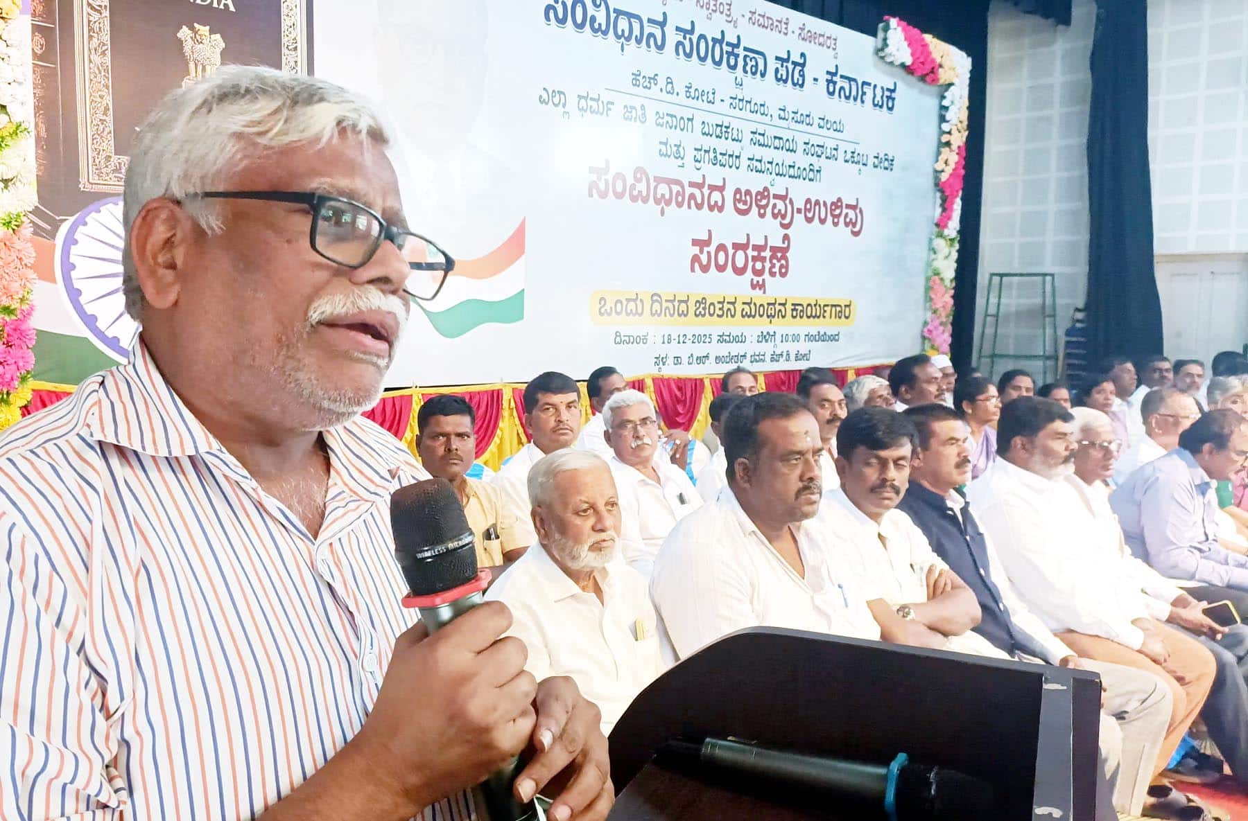 ಸಂವಿಧಾನ ಸಂರಕ್ಷಣಾ ಪಡೆ-ಕರ್ನಾಟಕ’ ಕೋಟೆ ಮತ್ತು ಸರಗೂರು ವತಿಯಿಂದ ‘ಸಂವಿಧಾನದ ಅಳಿವು-ಉಳಿವು ಸಂರಕ್ಷಣೆ’ ಕುರಿತಾಗಿ ನಡೆದ ಒಂದು ದಿನದ ಚಿಂತನ-ಮಂಥನ ಕಾರ್ಯಗಾರ ನಡೆಯಿತು.ಕಾರ್ಯಾಗಾರದಲ್ಲಿ ಮುಖ್ಯ ಚಿಂತಕ ಹಾಗೂ ರಾಜಕೀಯ ವಿಶ್ಲೇಷಕ ಶಿವಸುಂದರ್ ಮಾತನಾಡಿ, ಎಸ್.ಐ.ಆರ್ ಜಾರಿ ಮಾಡುವ ಮೂಲಕ ಸರ್ಕಾರ ಮೌನವಾಗಿ ಜನರ ಬೆನ್ನಿಗೆ ಇರಿದಿದೆ ಎಂದು ವ್ಯಾಖ್ಯಾನಿಸಿದರು.