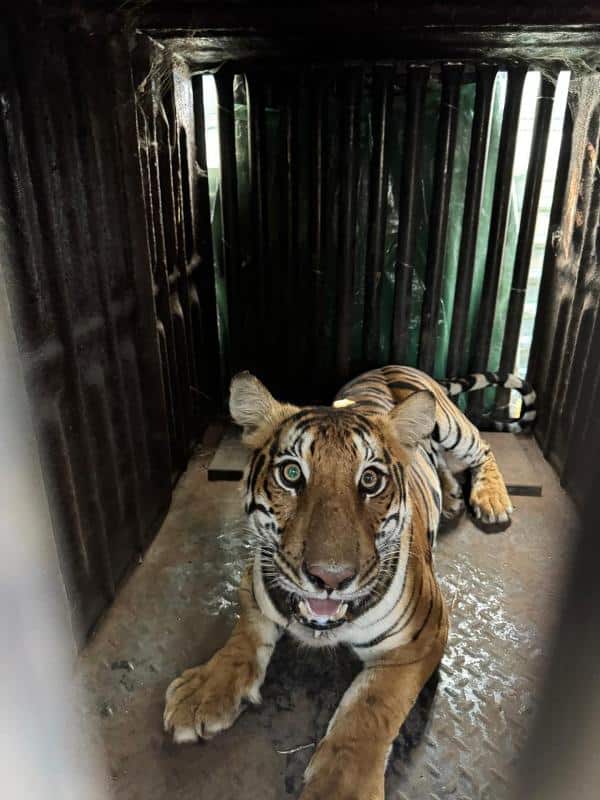 ಬೋನಿಗೆ ಹಸು ಕಟ್ಟಲಾಗಿತ್ತು. ಹಸಿವಿನಿಂದ ಕಂಗೆಟ್ಟಿದ್ದ ಸುಮಾರು 5 ವರ್ಷದ ಹೆಣ್ಣು ಹುಲಿ ಆಹಾರದ ಆಸೆಗೆ ಹೋಗಿ ಬೋನಿಗೆ ಬಂಧಿಯಾಗಿದೆ.