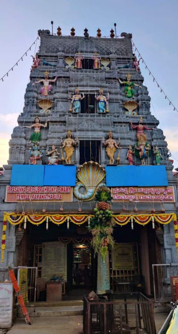 ಪ್ರಸನ್ನ ಸುಬ್ರಹ್ಮಣ್ಯಸ್ವಾಮಿ ದೇವಾಲಯ ನಿರ್ಮಾಣದ ಹಿಂದೆ ಐತಿಹ್ಯವಿದೆ. ಕುಕ್ಕೆ ಸುಬ್ರಹ್ಮಣ್ಯ ಮಠದ ಗುರು ಪರಂಪರೆಯ 14ನೇಯ ಶ್ರೀ ವಿಭುದೇಶ ತೀರ್ಥ ಪಾದಂಗಳವರು ಯಾತ್ರಾರ್ಥವಾಗಿ ಹೊರಟು ಶ್ರೀ ಕ್ಷೇತ್ರ ರಾಮನಾಥಪುರಕ್ಕೆ ಬಂದು ಇಲ್ಲಿಯ ಸಂಕ್ರಾಂತಿ ಮಂಟಪದಲ್ಲಿ ಬಿಡಾರ ಹೂಡಿದ್ದರು. ಆಗ ಕನಸಿನಲ್ಲಿ ಶ್ರೀ ಸುಬ್ರಹ್ಮಣ್ಯಸ್ವಾಮಿ ಬಂದು ಇಲ್ಲಿತನಕ ನಾನು ನಿನ್ನನ್ನು ಹಿಂಬಾಲಿಸಿದ್ದೇನೆ, ನಾನು ಇಲ್ಲಿಯೇ ನೆಲೆಸಲು ಅಪೇಕ್ಷಿಸುತ್ತೇನೆ. ನಿನ್ನ ಬಳಿಗೆ ಬಲ್ಲಾಳರಾಯನನ್ನು ಎಚ್ಚರಿಸಿ ಇಲ್ಲಿಗೆ ಕಳುಹಿಸುತ್ತೇನೆ, ಅವನ ಜೊತೆಗೆ ಹೊಳೆನರಸೀಪುರದ ಪಾಳೇಗಾರ ನರಸಪ್ಪನಾಯಕನ ಸಹಾಯದಿಂದ ನನ್ನನ್ನು ಇಲ್ಲಿ ಪ್ರತಿಷ್ಠಾಪಿಸುವಂತೆ ಹೇಳಿ ಹೊಳೆನರಸೀಪುರ ಪಾಳೇಯಗಾರ ನರಸಪ್ಪನಾಯಕನಿಗೂ ಕಾಣಿಸಿಕೊಂಡು, ರಾಮನಾಥಪುರದಲ್ಲಿ ಗುರುಗಳ ಇಚ್ಛೆಯಂತೆ ನಡೆದುಕೊಂಡರೆ ನಿನಗೆ ಸಂತಾನ ಪ್ರಾಪ್ತಿಯಾಗುವುದು ಎಂದು ಕಳುಹಿಸಿ ಶ್ರೀಗಳ ಮಾರ್ಗದರ್ಶನದಲ್ಲಿ ಶ್ರೀ ವಿಭುದೇಶ ತೀರ್ಥರು ಇಲ್ಲಿ ಸುಬ್ರಹ್ಮಣ್ಯ ಸ್ವಾಮಿ ಮೂರ್ತಿ ಪ್ರತಿಷ್ಠಾಪಿಸಿರುವ ಕುರಿತು ಇತಿಹಾಸದಲ್ಲಿ ಉಲ್ಲೇಖವಾಗಿದೆ.ಈ ದೇವಾಲಯ ದ್ರಾವಿಡ ಶೈಲಿಯಲ್ಲಿದ್ದು, ಸಾಕಷ್ಟು ದೊಡ್ಡದಾದ ದೇವಾಲಯವಾಗಿದೆ. ಅಂದಿನಿಂದಲೂ ಜಾತ್ರೆ ಉತ್ಸವಗಳು ಇಲ್ಲಿ ನಡೆಯುತ್ತಿವೆ. ಪಂಚಮಿಯಂದು ರಥೋತ್ಸವ ನಡೆಯುತ್ತದೆ. ಮಾರ್ಗಶಿರ ಶುದ್ಧ ಷಷ್ಠಿಯಂದು ನಡೆಯುವ ರಥೋತ್ಸವ ಮೈಸೂರು ಸೀಮೆಯ ಜಾತ್ರೆಯ ಪೈಕಿ ರಾಮನಾಥಪುರದ ರಥೋತ್ಸವ ಪ್ರಥಮವಾಗಿದೆ. ರಥವನ್ನು ವಿವಿಧ ಅಲಂಕಾರಗಳಿಂದ ವರ್ಣರಂಜಿತವಾಗಿಸಿ ತೇರಿನಲ್ಲಿ ಸುಬ್ರಹ್ಮಣ್ಯೇಶ್ವರ ಸ್ವಾಮಿಯನ್ನು ಪ್ರತಿಷ್ಠಾಪಿಸಿ ರಥ ಎಳೆಯುವುದನ್ನು ಕಣ್ತುಂಬಿಕೊಳ್ಳಲು ಸಾವಿರಾರು ಯಾತ್ರಾರ್ಥಿಗಳು ಪಾಲ್ಗೊಂಡು ದೇವರ ದರ್ಶನಕ್ಕೆ ಪಾತ್ರರಾಗುತ್ತಾರೆ.