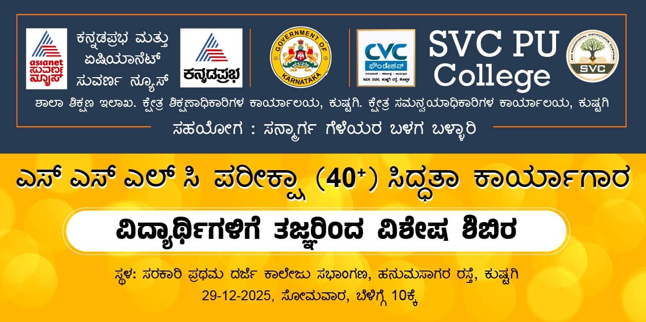 ಕುಷ್ಟಗಿ: ಕಳೆದ ವರ್ಷದಂತೆ ಈ ವರ್ಷವೂ ಕನ್ನಡಪ್ರಭ, ಏಷ್ಯಾನೆಟ್ ಸುವರ್ಣ ನ್ಯೂಸ್, ಶಾಲಾ ಶಿಕ್ಷಣ ಇಲಾಖೆ, ಶ್ರೀವಿಜಯ ಚಂದ್ರಶೇಖರ ಶೈಕ್ಷಣಿಕ ಮತ್ತು ಗ್ರಾಮೀಣಾಭಿವೃದ್ಧಿ ಟ್ರಸ್ಟ್ ಹಾಗೂ ಬಳ್ಳಾರಿ ಸನ್ಮಾರ್ಗ ಗೆಳೆಯರ ಬಳಗದ ಸಹಯೋಗದಲ್ಲಿ ಪಟ್ಟಣದ ಸರ್ಕಾರಿ ಪ್ರಥಮ ದರ್ಜೆ ಕಾಲೇಜು ಸಭಾಂಗಣದಲ್ಲಿ ತಾಲೂಕಿನ ಸರ್ಕಾರಿ ಶಾಲೆಯ ಎಸ್ಸೆಸ್ಸೆಲ್ಸಿ ವಿದ್ಯಾರ್ಥಿಗಳಿಗೆ (40+) ಪರೀಕ್ಷಾ ಸಿದ್ಧತಾ ಕಾರ್ಯಾಗಾರ, ವಿದ್ಯಾರ್ಥಿಗಳಿಗೆ ತಜ್ಞರಿಂದ ವಿಶೇಷ ಶಿಬಿರ ಡಿ. 29 ರಂದು ಬೆಳಗ್ಗೆ 10 ಗಂಟೆಗೆ ನಡೆಯಲಿದೆ.