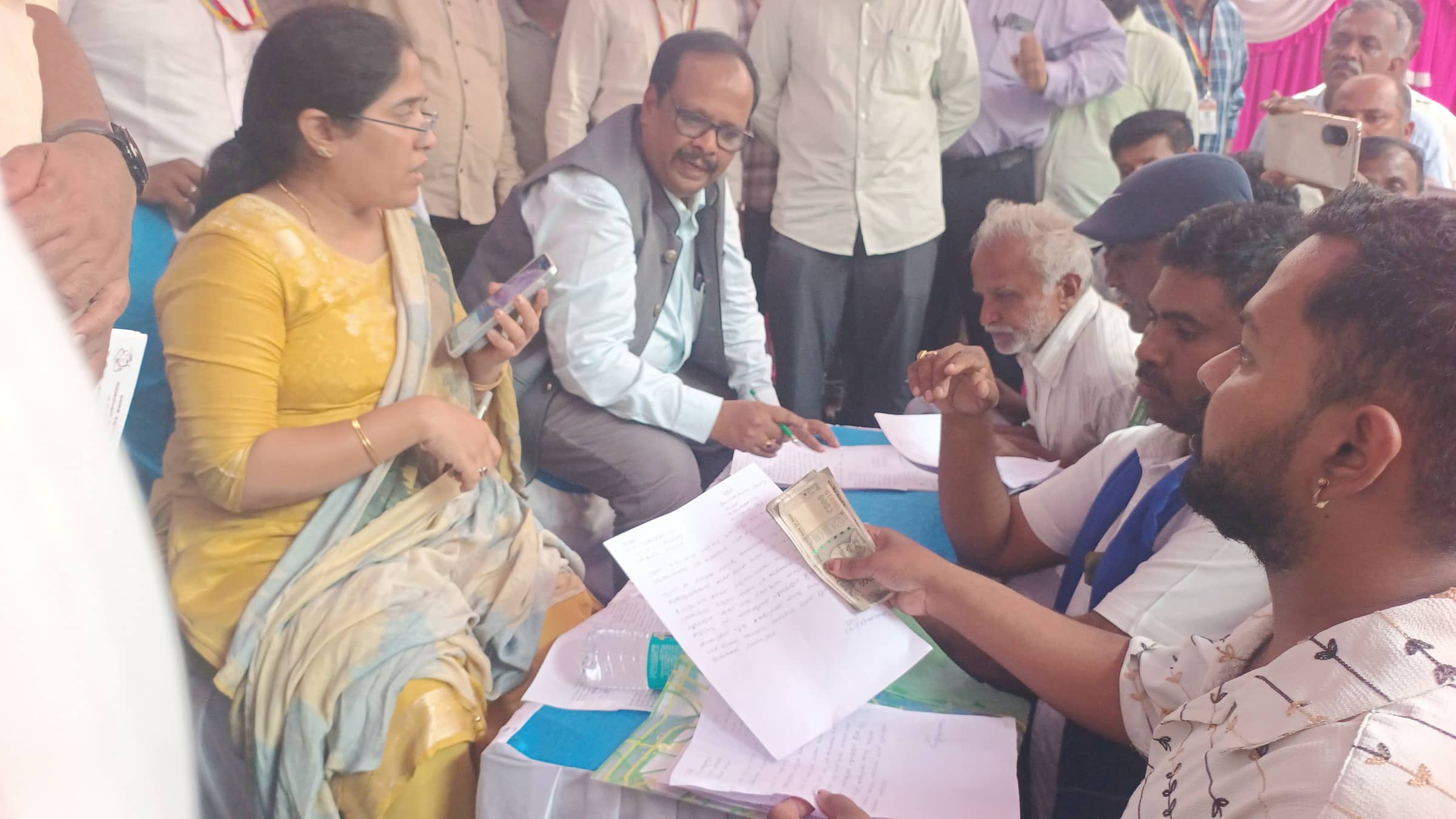 ಮೇಡಂ. ನಿಮ್ ಕಚೇರಿ ಸಿಬ್ಬಂದಿ ನಮ್ಮ ಜಮೀನಿನಲ್ಲಿ ಆಗಿದ್ದ ತಪ್ಪಿನ ತಿದ್ದುಪಡಿ ಮಾಡಲು 20 ಸಾವಿರ ಲಂಚ ಕೇಳಿದ್ದರು. ಈಗಾಗಲೇ 5 ಸಾವಿರ ಕೊಟ್ಟಿದ್ದೇನೆ. ಉಳಿದ 15 ಸಾವಿರ ರುಗಳನ್ನು ಮೇಡಂ ಗೆ ಕೊಡಬೇಕು ಅಂತ ಹೇಳಿದ್ರು. ಅದರ ಆಡಿಯೋ ರೆಕಾರ್ಡ್ ಇದೆ. ದಯವಿಟ್ಟು ಈ ಹಣ ತೆಗೆದುಕೊಂಡು ನನ್ನ ಜಮೀನಿಗೆ ಸಂಬಂಧಿಸಿದಂತೆ ತಿದ್ದುಪಡಿ ಮಾಡಿಕೊಡಿ.ಹೀಗೆ ಸಂಪಿಗೆ ಗ್ರಾಮದ ನಾಗೇಶ್ ಎಂಬ ರೈತ ಉಪ ವಿಭಾಗಾಧಿಕಾರಿ ಸಪ್ತಶ್ರೀ ಯವರ ಬಳಿ ಮನವಿ ಪತ್ರ ಮತ್ತು 15 ಸಾವಿರ ನಗದನ್ನು ಹಿಡಿದು ಜಿಲ್ಲಾ ಅಪರ ಜಿಲ್ಲಾಧಿಕಾರಿಗಳ ಸಮ್ಮುಖವೇ ಕೈ ಮುಗಿದು ಕೇಳಿಕೊಂಡ. ಈ ಘಟನೆ ನಡೆದ್ದದ್ದು ತಾಲೂಕು ಆಡಳಿತ ಸೌಧದ ಎದುರು ಜಿಲ್ಲಾಡಳಿತದ ವತಿಯಿಂದ ನಡೆದ ಜನ ಸಂಪರ್ಕ ಸಭೆಯ ವೇಳೆ ಸಂಪಿಗೆಯ ನಾಗೇಶ್ ಎಂಬ ರೈತ ತನ್ನ ಜಮೀನಿನ ದಾಖಲೆಯಲ್ಲಿ ಆಗಿದ್ದ ತಪ್ಪನ್ನು ಸರಿಪಡಿಸಿ ಎಂದು ಕಳೆದ ಮೂರ್ನಾಲ್ಕು ತಿಂಗಳಿನಿಂದ ತಿಪಟೂರು ಉಪವಿಭಾಗಾಧಿಕಾರಿಗಳ ಕಚೇರಿಗೆ ಅಲೆದು ಅಲೆದು ಸಾಕಾಗಿದ್ದ. ತಿದ್ದುಪಡಿ ಮಾಡಲು ಅಲ್ಲಿನ ಗುಮಾಸ್ತರು 20 ಸಾವಿರ ಲಂಚದ ಬೇಡಿಕೆ ಇಟ್ಟಿದ್ದರು. ಇದಕ್ಕೆ ಅಲ್ಲಿನ ಡಿ ಗ್ರೂಪ್ ನೌಕರನೂ ಶಾಮೀಲಾಗಿದ್ದ. ಈಗಾಗಲೇ 5 ಸಾವಿರ ಲಂಚ ನೀಡಿದ್ದೇನೆ. ಆದರೂ ಇನ್ನೂ 15 ಸಾವಿರ ರು ಕೊಡದೇ ಕೆಲಸ ಮಾಡುವುದಿಲ್ಲ ಎಂದು ಪಟ್ಟು ಹಿಡಿದಿದ್ದರು. ಅವರು ಲಂಚಕ್ಕೆ ಬೇಡಿಕೆ ಇಟ್ಟಿದ್ದ ಸಂಗತಿಯನ್ನು ಮೊಬೈಲ್ ನಲ್ಲಿ ರೆಕಾರ್ಡ್ ಮಾಡಿಕೊಂಡಿದ್ದ. 15 ಸಾವಿರ ರು. ನಿಮಗೇ ನೀಡಬೇಕೆಂದು ಅವರು ಆಗ್ರಹಿಸಿದ್ದಾರೆ. ಹಾಗಾಗಿ ನಿಮಗೇ ಈ ಹಣ ನೇರವಾಗಿ ಕೊಡ್ತಾ ಇದ್ದೇನೆ. ಇದನ್ನು ತೆಗೆದುಕೊಂಡು ದಯಮಾಡಿ ನನ್ನ ಕೆಲಸ ಮಾಡಿಕೊಡಿ ಎಂದು ಕೈ ಮುಗಿದ. ಈ ಘಟನೆಯಿಂದ ವಿಚಲಿತರಾದ ಉಪವಿಭಾಗಾಧಿಕಾರಿ ಸಪ್ತಶ್ರೀ, ಏನಪ್ಪಾ. ಯಾರ ಹತ್ರ ಮಾತಾಡ್ತಾ ಇದ್ಯ. ಯಾರು ನಿನಗೆ ಲಂಚಕ್ಕೆ ಬೇಡಿಕೆ ಇಟ್ಟಿದ್ದಾರೋ ಅವರ ಬಗ್ಗೆ ಲಿಖಿತ ದೂರು ನೀಡು. ಕ್ರಮ ಕೈಗೊಳ್ತೇನೆ. ಹೀಗೆಲ್ಲಾ ಮಾಡಬೇಡ ಎಂದು ಸಂಪಿಗೆಯ ರೈತ ನಾಗೇಶ್ ಗೆ ಸಮಾಧಾನ ಮಾಡಿದರು. ಜಾಗಟೆ ಬಾರಿಸಿ ಪ್ರತಿಭಟನೆ