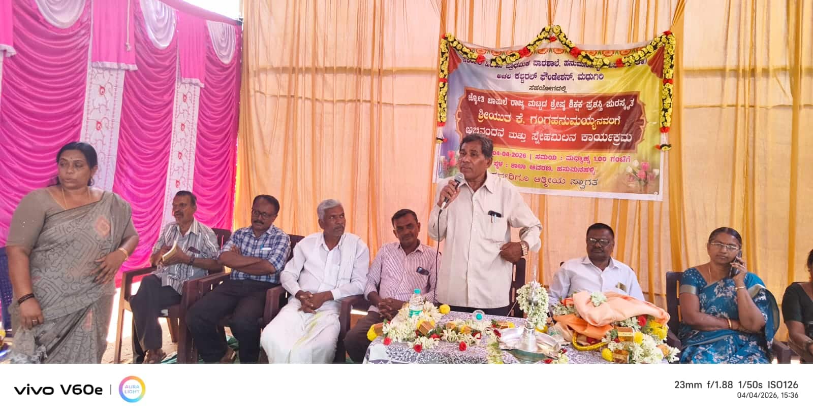 ತಾಲೂಕಿನ ಹನುಮನಹಳ್ಳಿ ಸರ್ಕಾರಿ ಪ್ರಾಥಮಿಕ ಶಾಲೆಯ ಮುಖ್ಯಶಿಕ್ಷಕ ಗಂಗಹನುಮಯ್ಯರಿಗೆ ಜ್ಯೋತಿಬಾಪುಲೆ ರಾಜ್ಯಮಟ್ಟದ ಶ್ರೇಷ್ಠ ಶಿಕ್ಷಕ ಪ್ರಶಸ್ತಿ, ಸ್ನೇಹ ಸಮ್ಮೀಲನ ಕಾರ್ಯಕ್ರಮ ಉದ್ಘಾಟಿಸಿ ಮಾತನಾಡಿದರು.19 ವರ್ಷಗಳ ಕಾಲ ಒಂದೇ ಶಾಲೆಯಲ್ಲಿ ಕೆಲಸ ಮಾಡುವುದು ಸುಲಭದ ಮಾತಲ್ಲ. ತನ್ನದೇ ಆದ ಬದ್ಧತೆ, ಮೌಲ್ಯಾದರ್ಶಗಳನ್ನು ರೂಢಿಸಿಕೊಂಡ ಶಿಕ್ಷಕರಿಗೆ ಮಾತ್ರ ಅದು ಸಾಧ್ಯ, ಅಂಥವರು ವಿದ್ಯಾರ್ಥಿಗಳಿಗೆ ಪ್ರೇರಕ ಶಕ್ತಿಯಾಗುತ್ತಾರೆ ಎಂದರು.
