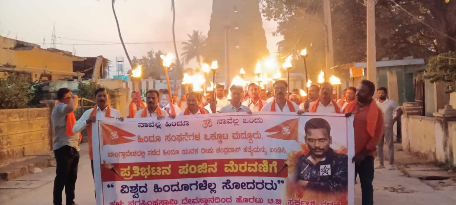 ಬಾಂಗ್ಲಾದೇಶದಲ್ಲಿ ನಡೆಯುತ್ತಿರುವ ಹಿಂದೂಗಳ ಹತ್ಯೆ ಖಂಡಿಸಿ ವಿಶ್ವ ಹಿಂದೂ ಪರಿಷತ್ ಮತ್ತು ಬಜರಂಗದಳದ ಕಾರ್ಯಕರ್ತರು ಶನಿವಾರ ಪಟ್ಟಣದಲ್ಲಿ ಪಂಜಿನ ಮೆರವಣಿಗೆ ನಡೆಸಿದರು.ಬಜರಂಗದಳ ಮತ್ತು ವಿಶ್ವ ಹಿಂದೂ ಪರಿಷತ್ ಮುಖಂಡರ ನೇತೃತ್ವದಲ್ಲಿ ಶ್ರೀನರಸಿಂಹ ಸ್ವಾಮಿ ದೇವಾಲಯದ ಬಳಿ ಸೇರಿದ ನೂರಾರು ಕಾರ್ಯಕರ್ತರು ನಂತರ ಕೋಟೆ ಬೀದಿ, ಪೇಟೆ ಬೀದಿ ಗಳಮೂಲಕ ಪ್ರವಾಸಿ ಮಂದಿರದವರೆಗೆ ಬೃಹತ್ ಪಂಜಿನ ಮೆರವಣಿಗೆ ನಡೆಸಿದರು.