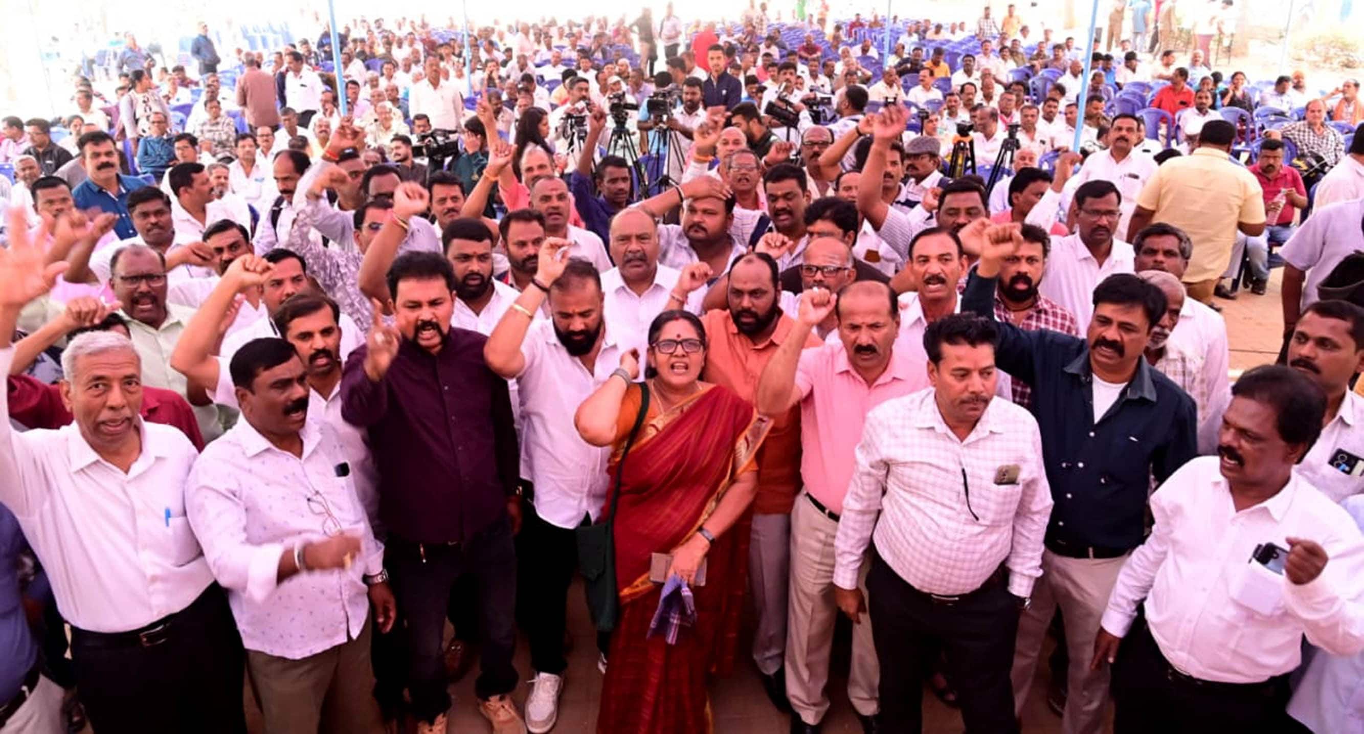 38 ತಿಂಗಳ ವೇತನ ಹೆಚ್ಚಳ ಹಿಂಬಾಕಿ ಪಾವತಿಸಬೇಕು ಹಾಗೂ 2024ರ ಜ.1ರಿಂದ ಅನ್ವಯವಾಗುವಂತೆ ಹೊಸದಾಗಿ ವೇತನ ಹೆಚ್ಚಳ ಮಾಡಬೇಕು ಎಂದು ಆಗ್ರಹಿಸಿ ಕೆಎಸ್ಆರ್ಟಿಸಿ ಸಂಘಟನೆಗಳ ಜಂಟಿ ಕ್ರಿಯಾ ಸಮಿತಿ ನೇತೃತ್ವದಲ್ಲಿ ಗುರುವಾರ ಸಾರಿಗೆ ನೌಕರರು ಸ್ವಾತಂತ್ರ್ಯ ಉದ್ಯಾನದಲ್ಲಿ ಪ್ರತಿಭಟನೆ ನಡೆಸಿದರು.ಈ ವೇಳೆ 26 ತಿಂಗಳ ವೇತನ ಹೆಚ್ಚಳ ಹಿಂಬಾಕಿ ಪಾವತಿ ಹಾಗೂ 2025ರ ಏ. 1ರಿಂದ ಅನ್ವಯವಾಗುವಂತೆ ವೇತನ ಹೆಚ್ಚಳ ಮಾಡುವುದಾಗಿ ಸರ್ಕಾರ ಮಾಡಿರುವ ಆದೇಶವನ್ನು ಒಪ್ಪುವುದಿಲ್ಲ ಎಂದು ತಿಳಿಸಿದ ಸಾರಿಗೆ ನೌಕರರು, ಮಾ. 2ರೊಳಗೆ ತಮ್ಮ ಬೇಡಿಕೆಯನ್ನು ಪೂರ್ಣಪ್ರಮಾಣದಲ್ಲಿ ಈಡೇರಿಸಬೇಕು ಎಂದು ಆಗ್ರಹಿಸಿದರು.